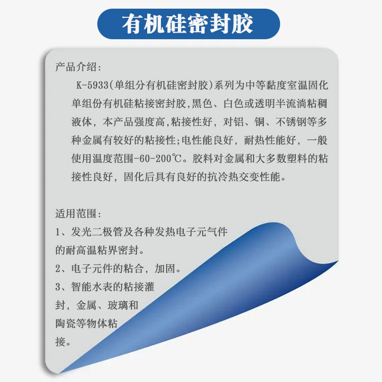 K-5933(单组分有机硅密封胶)系列为中等黏度室温固化单组份有机硅粘接密封胶,半流淌粘稠液体,本产品强度高,粘接性好,对铝、铜、不锈钢等多种金属有较好的粘接性;电性能优越,耐热性能好,一般使用温度范围-60℃~200