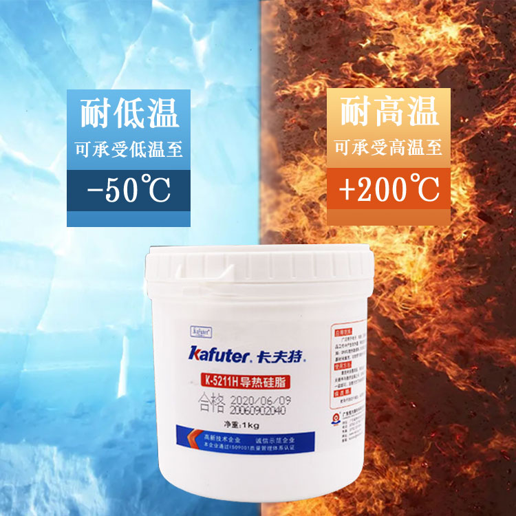 K-5211导热硅脂采用进口原料配方生产,使用导热性和绝缘性良好的金属氧化物与有机硅氧烷复合而成的膏脂状物。产品具有良好的导热性和电绝缘性,较宽的使用温度(工作温度-50℃~+200℃),很好的使用稳定性,较低的稠度和良好的施工性能。卡夫特Kafuter官方授权经销商-东莞德润密封材料有限公司