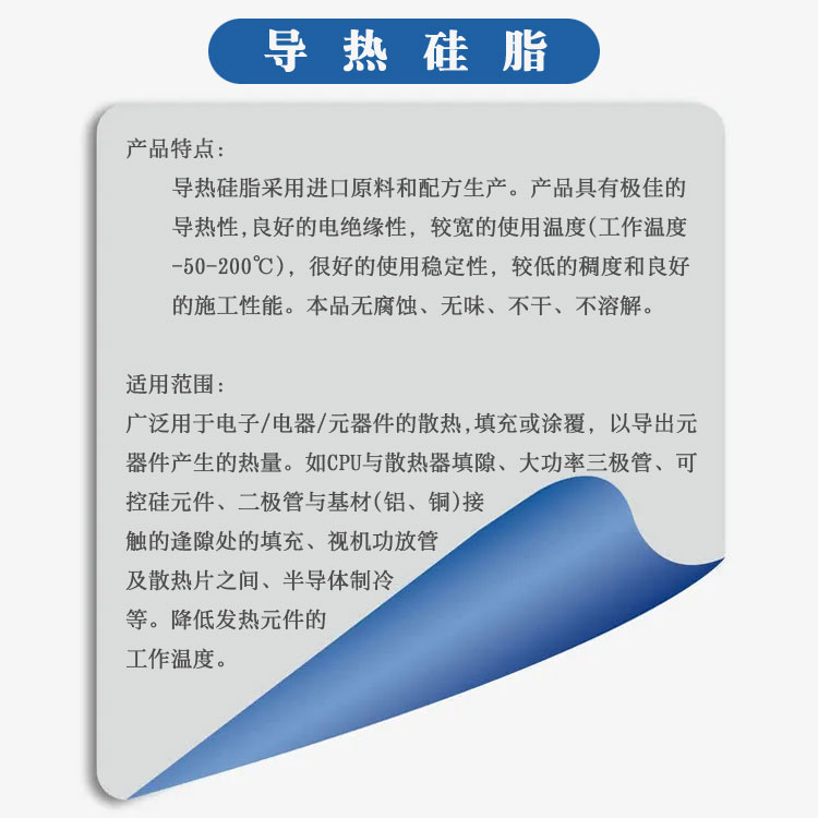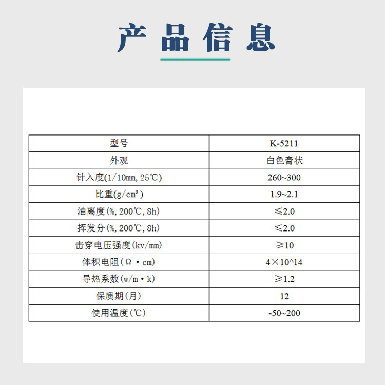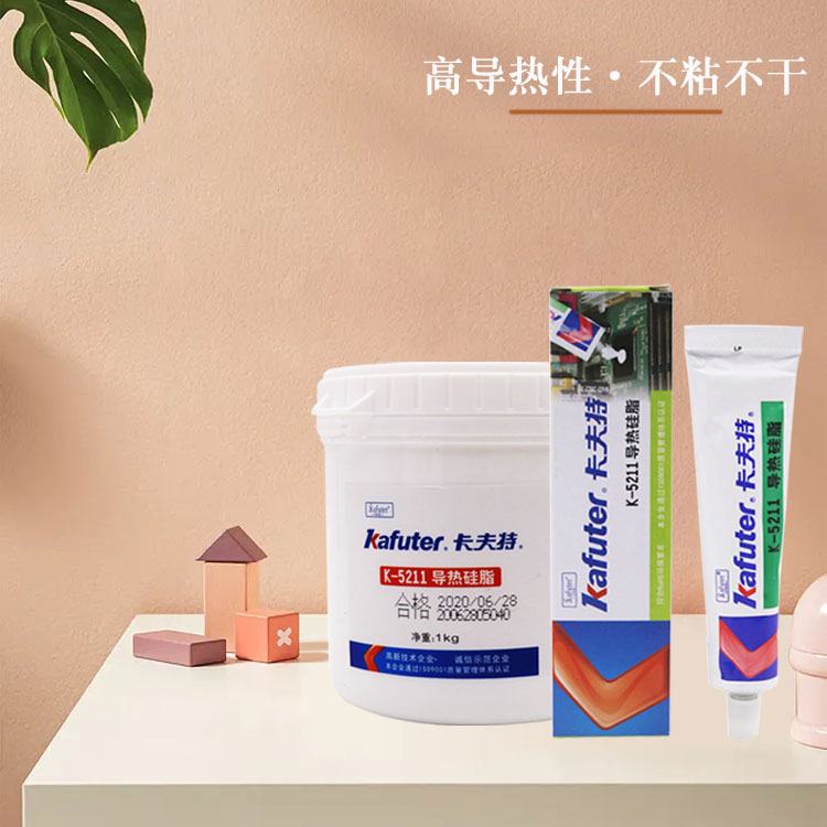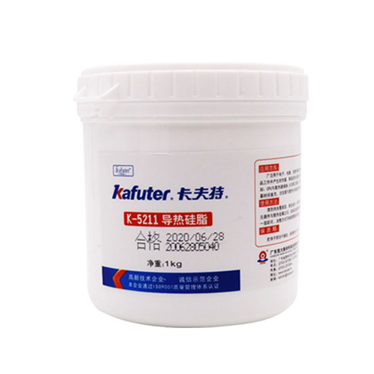 K-5211/5211H导热硅脂[1.2w/m.k]导热硅脂采用进口原料配方生产,使用导热性和绝缘性良好的金属氧化物与有机硅氧烷复合而成的膏脂状物。产品具有良好的导热性和电绝缘性,较宽的使用温度(工作温度-50℃~+200℃)很好的使用稳定性,较低的稠度和良好的施工性能。卡夫特Kafuter官方授权经销商-东莞德润密封材料有限公司