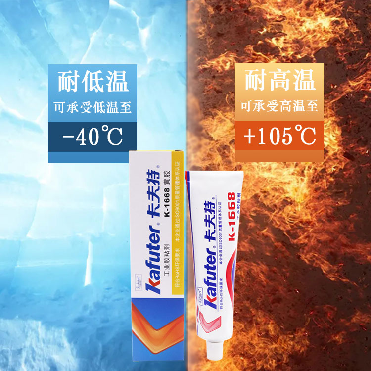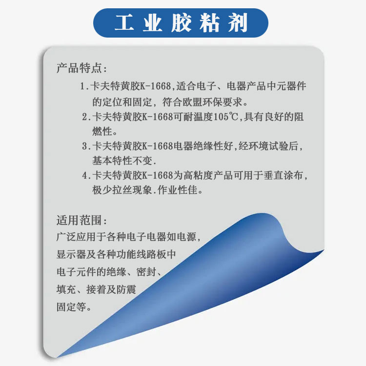卡夫特K-1668黄胶适用于电子、电器产品中元器件的定位和固定。粘度高, 可用于垂直涂布; 固化后具有良好的阻燃性和绝缘性,经环境试验后,基本特性不变。