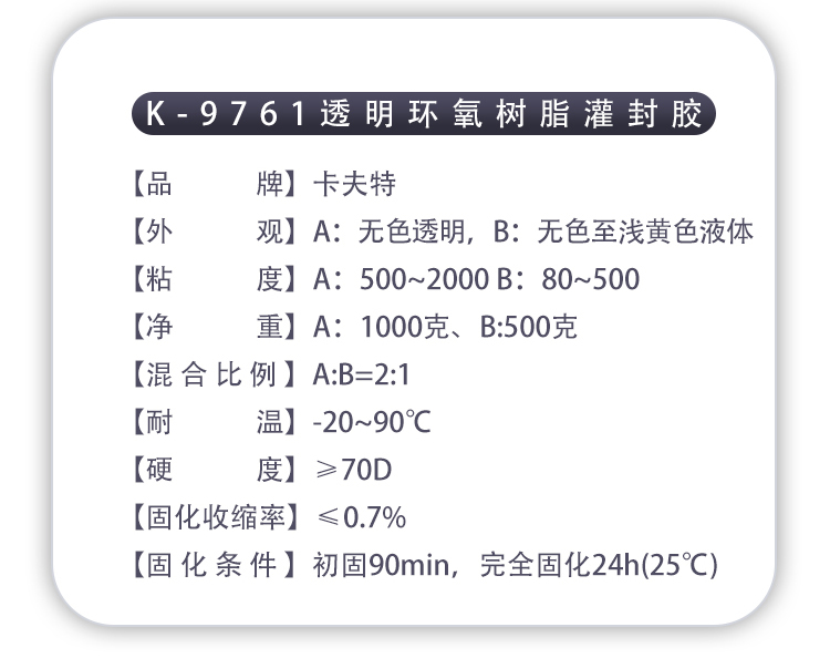 K-9761用于有透明要求的电子元器件和模块的灌封。常温可固化,固化后收缩率低,固化物透明光亮,不开裂,防潮,绝缘,耐湿热和大气老化。也可根据需要调配颜色。卡夫特Kafuter官方授权经销商-东莞德润密封材料有限公司