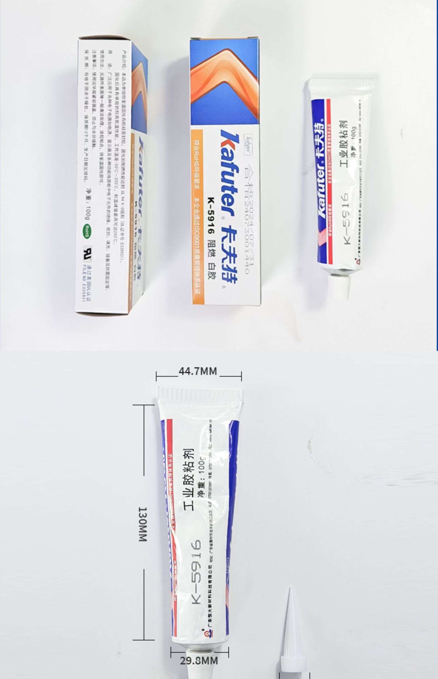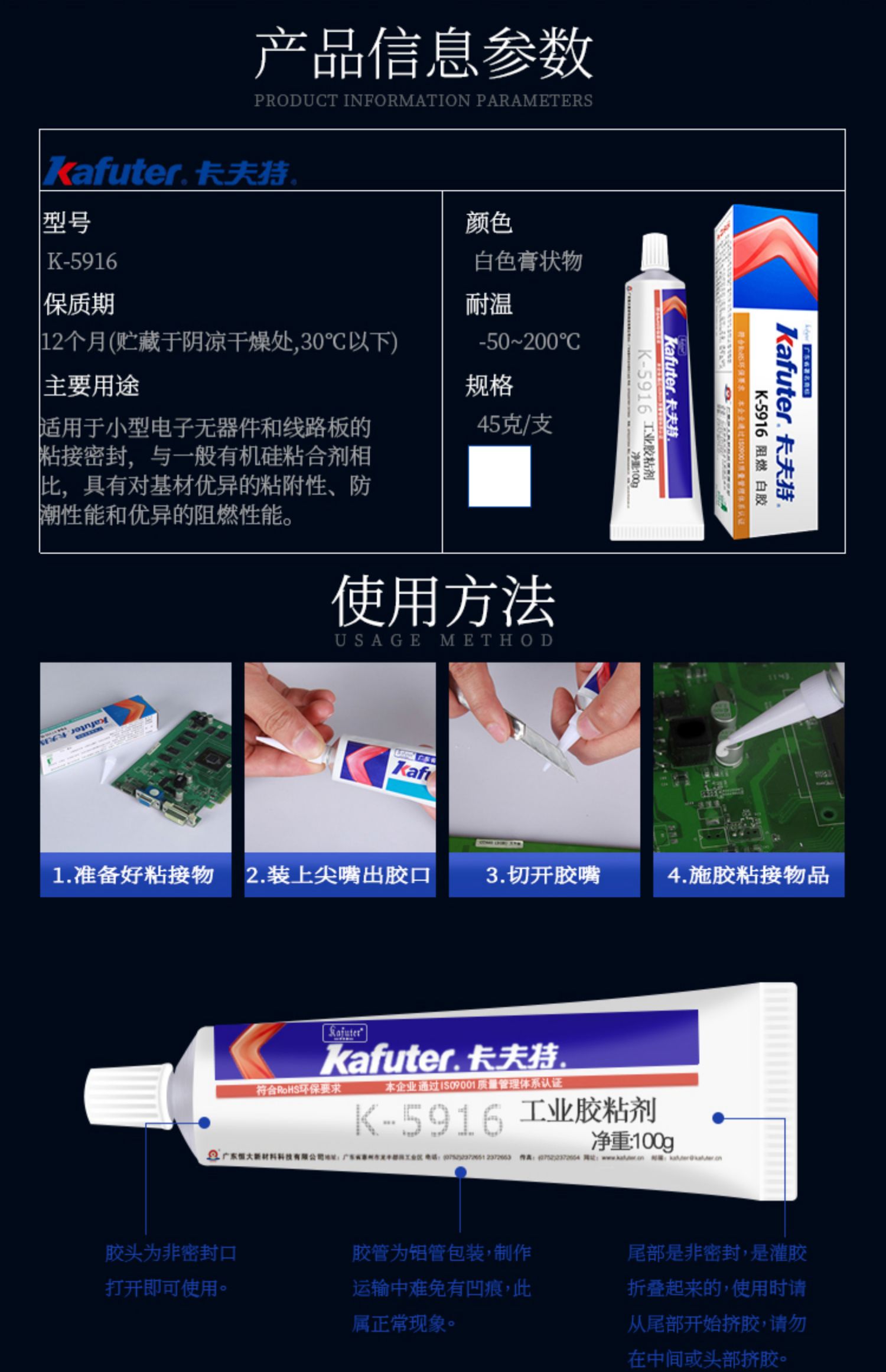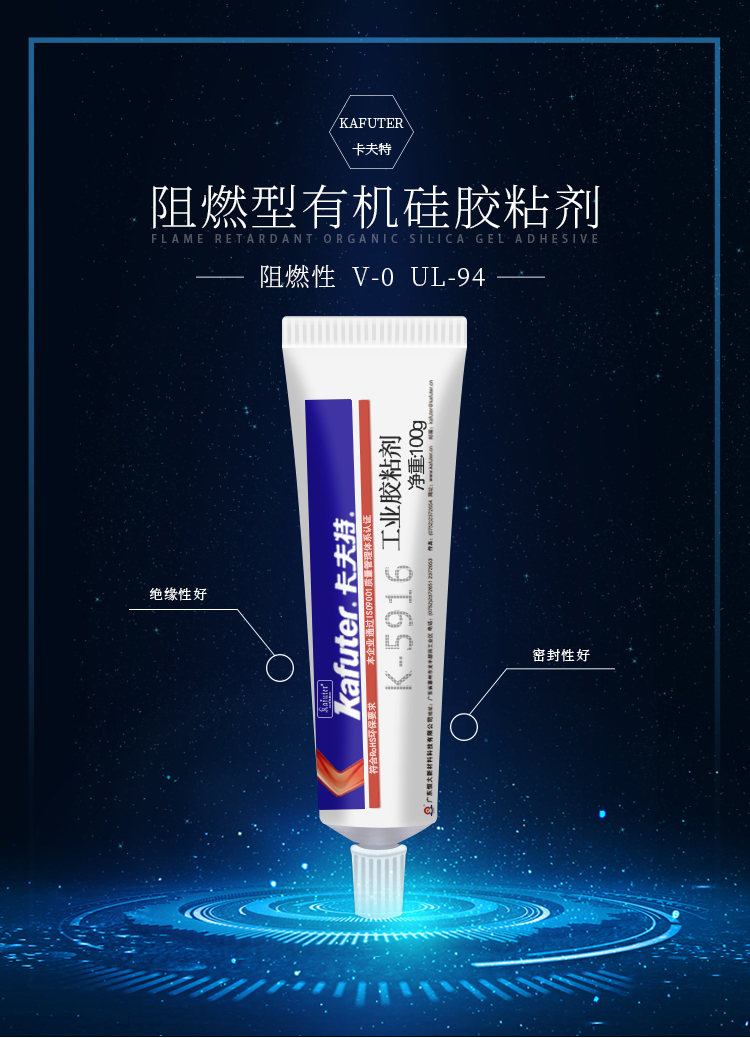卡夫特 K-5916白胶卡夫特K-5916是一种单组份室温固化的阻燃型有机硅胶粘剂,阻燃性好:阻燃性能达到UL 94 V - 0级别,UL证书号:E335921。 适用范围广:胶料对金属和大多数塑料的粘接性良好,与一般有机硅粘合剂相比,具有对基材更好的粘附性、防潮性能。主要用于电子电器元器件的固定及阻燃、绝缘密封防水,如电源供应器的接着与填充密封,也可用于其它多种阻燃密封用途。卡夫特Kafuter官方授权经销商-东莞德润密封材料有限公司www.gzderun.com,销售服务热线:15817734885,李经理