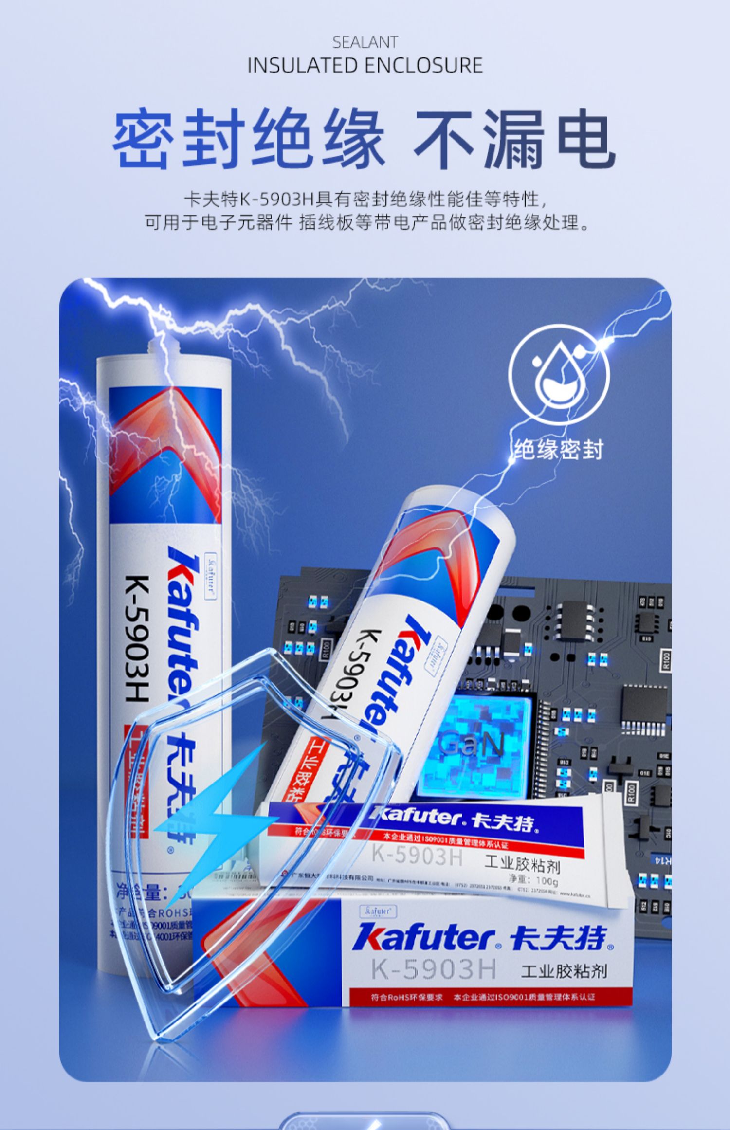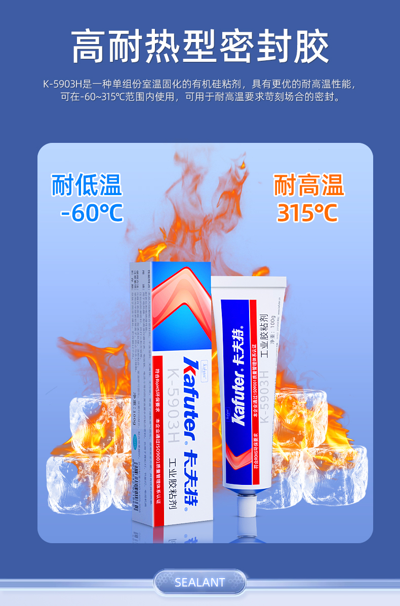 K-5903/5903H(高耐热型有机硅粘接密封胶)是一种单组分室温固化的有机硅粘界密封胶,具有更优的耐高温性能。可在-60~315C范围内使用,可防潮,抗震,耐电晕,抗漏电和耐老化性能,普遍用于耐高温要求苛刻场合的粘接和密封。卡夫特Kafuter官方授权经销商-东莞德润密封材料有限公司