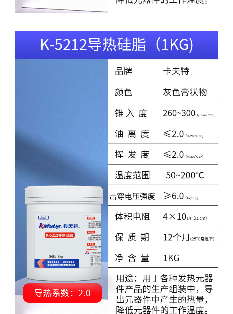 K-5212导热硅脂本产品采用进口原料配方生产,使用导热性和绝缘性良好的金属化合物与有机硅氧烷复合而成的有脂状物。产品具有良好的导热性和电绝缘性,较宽的使用温度(工作温度-50℃~+200℃),很好的使用稳定性,较低稠度和良好的施工性能。卡夫特Kafuter官方授权经销商-东莞德润密封材料有限公司