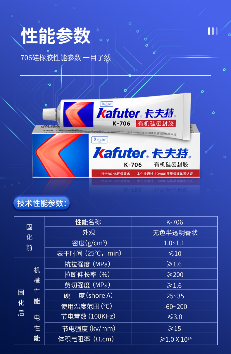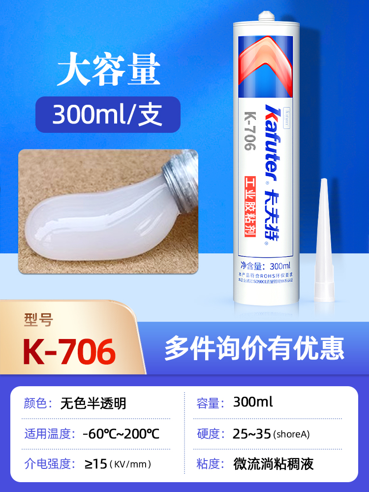 K-706(快干型有机硅密封胶)是一种可进行快速粘接的有机硅胶粘剂,绝缘性优、粘接性好,防、抗震、耐电晕、抗漏电。胶料对金属和大多数塑料的粘接性良好,固化后具有出色的抗冷热交变性能(-60 200℃)。卡夫特Kafuter官方授权经销商-东莞德润密封材料有限公司