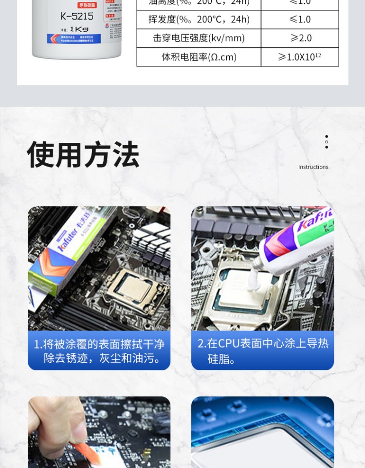 K-5211导热硅脂采用进口原料配方生产,使用导热性和绝缘性良好的金属氧化物与有机硅氧烷复合而成的膏脂状物。产品具有良好的导热性和电绝缘性,较宽的使用温度(工作温度-50C~+200C>很好的使用稳定性,较低的稠度和良好的施工性能。