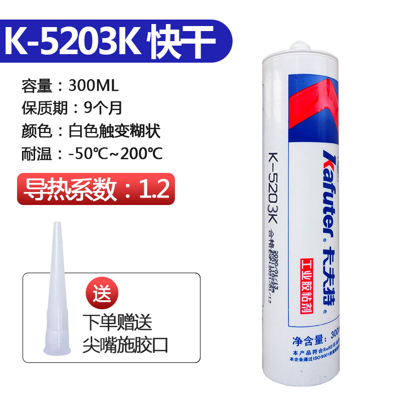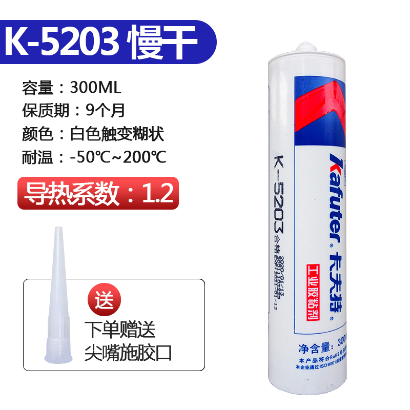 K-5203K导热硅胶(导热系数1.2)有机硅导热胶是一种单组分室温固化中性胶,既有粘接作用,又有良好的导热(散热)性,添特殊导热补强填料,具有较高的粘接强度,长期使用不会脱落,不会产生接触缝隙降低散热效果;该胶具有良好的耐高低温性能,它的使用温度范围-50