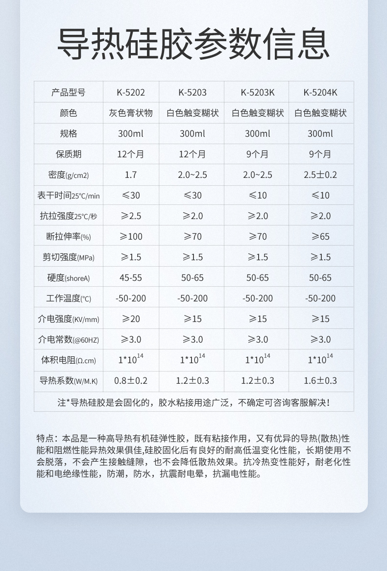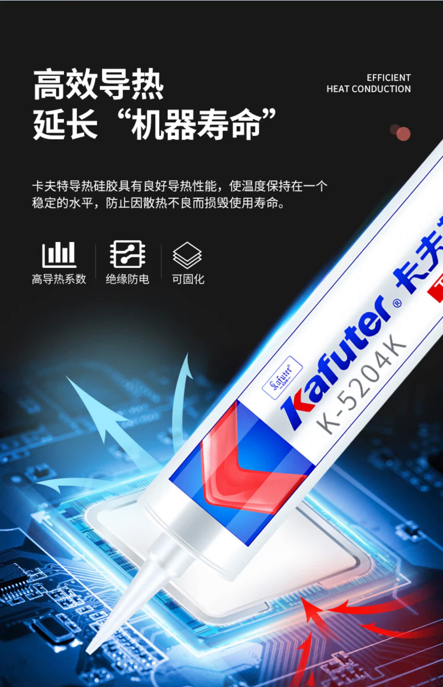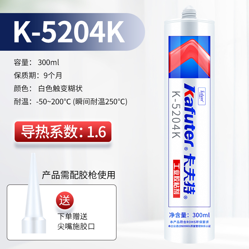 卡夫特K-5204K散热膏2.0高导热系数导热硅胶 快干绝缘耐高温芯片散热膏K-5204K导热硅胶(导热系数1.6)有机硅导热胶既有粘接作用,又有优异的导热(散热)性。是一种经过补强的中性有机硅弹性胶,胶固化后有良好的耐高低变化性能,长期使用不会脱落,不会产生接触缝隙降低散热效果;因为有了补强,该胶有较高的粘接强度,剪切强度z15公斤/平方厘米。具有优异的耐高低温性能。它的使用温度范围为-60℃~200℃;该胶是一种单组分室温固化胶。卡夫特Kafuter官方授权经销商-东莞德润密封材料有限公司www.gzderun.com,销售服务热线:15817734885,李经理