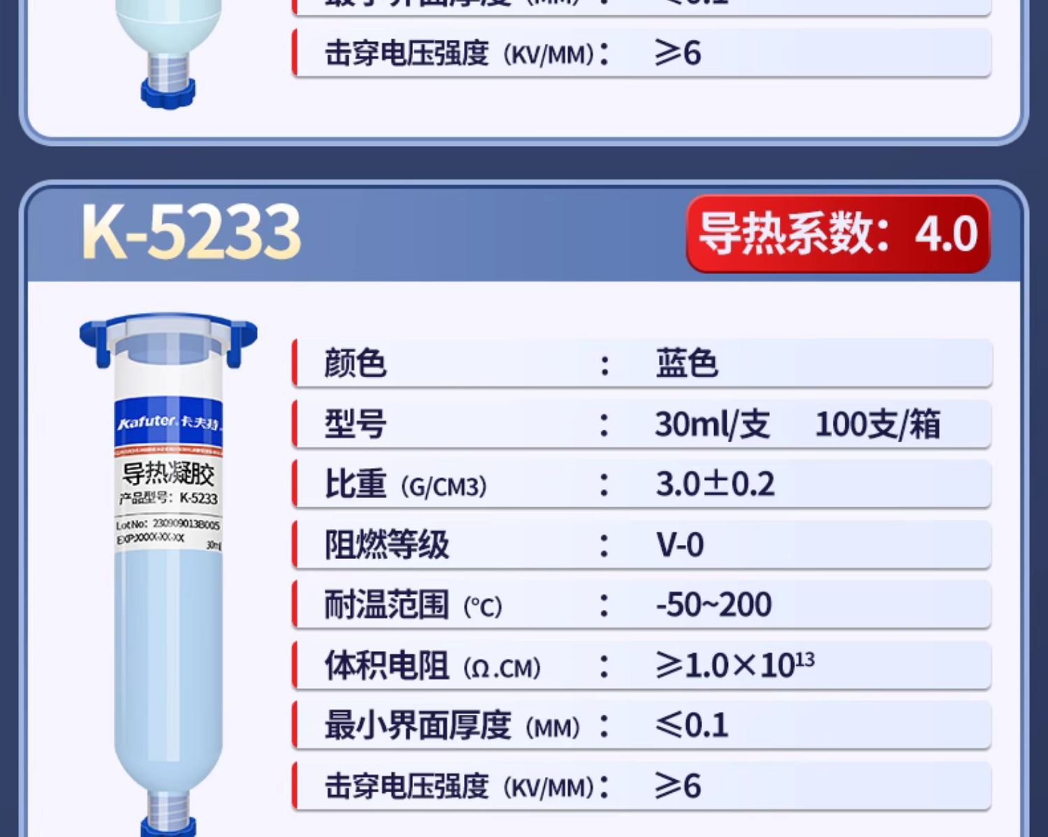 K-5231导热凝胶1.2w/(m.k)导热凝胶是一种高性能导热凝胶,它以硅胶为基体,填充以多种高性能陶瓷粉末制成,具有导热系数高、热阻低在散热部件上帖服性良好,绝缘,可自动填补空隙,最大限度的增加有限接触面积,可以压缩的特点。
