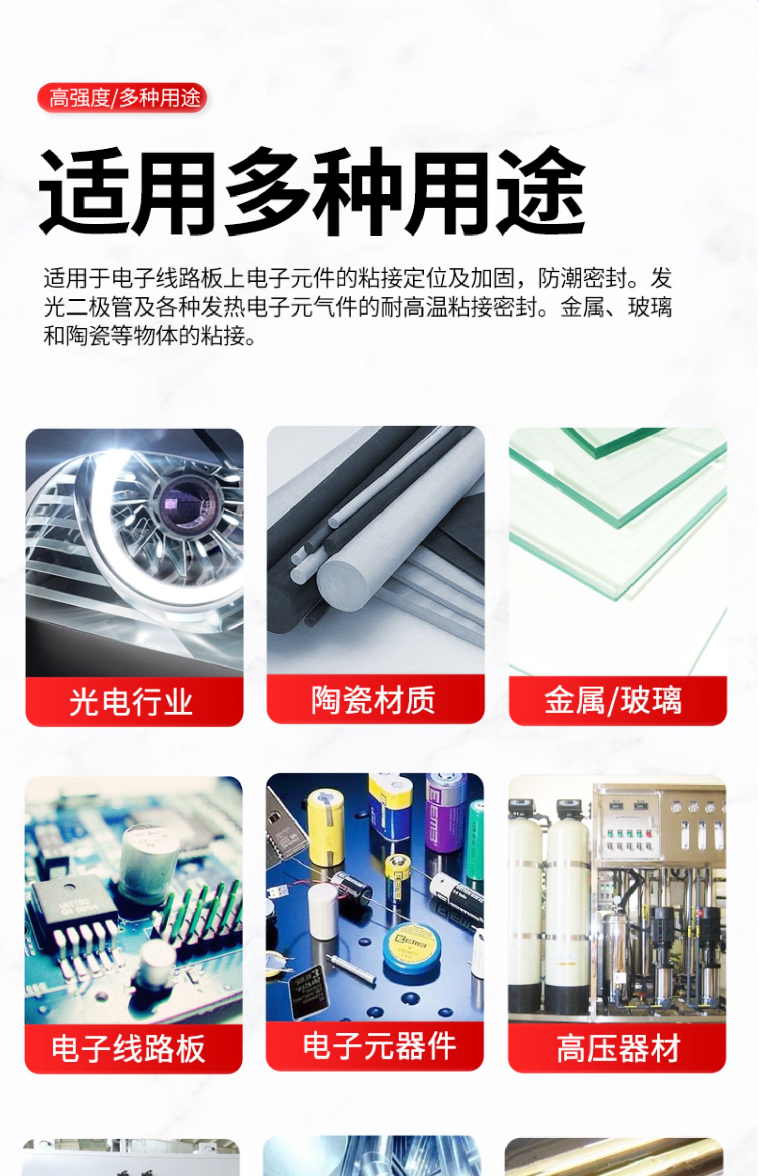 半透明/MW白色/B黑色(快干型有机硅密封胶)系列是一种可进行快速粘接的有机硅胶粘剂,绝缘性优、粘接性好,防潮、抗震、耐电晕、抗漏电。胶料对金属和大多数塑料的粘接性良好,固化后具有出色的抗冷热交变性能(-60~200℃)。