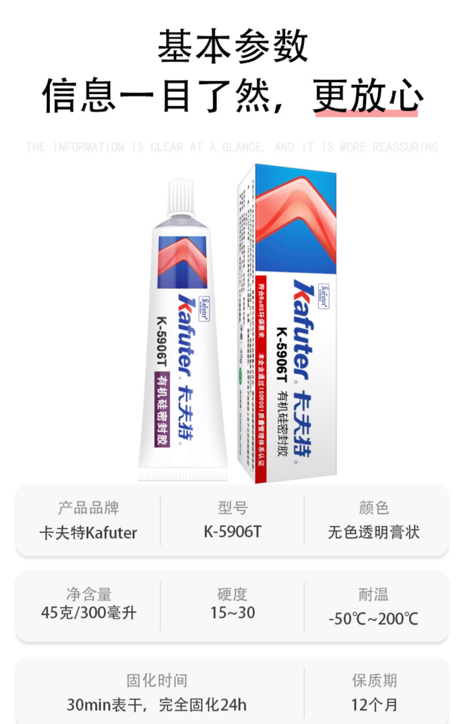 K-5906T(有机硅粘接密封胶)是一种单组分室温固化硅橡胶,强度高、触变性好、中性无腐蚀,具有耐高温、高压、耐溶剂、低收缩、无塌陷等特性,耐温性好(-60~+200℃)。适用于大间隙(0~6mm)的粘合密封,可防水、防油,抗冲击、振动。卡夫特Kafuter官方授权经销商-东莞德润密封材料有限公司