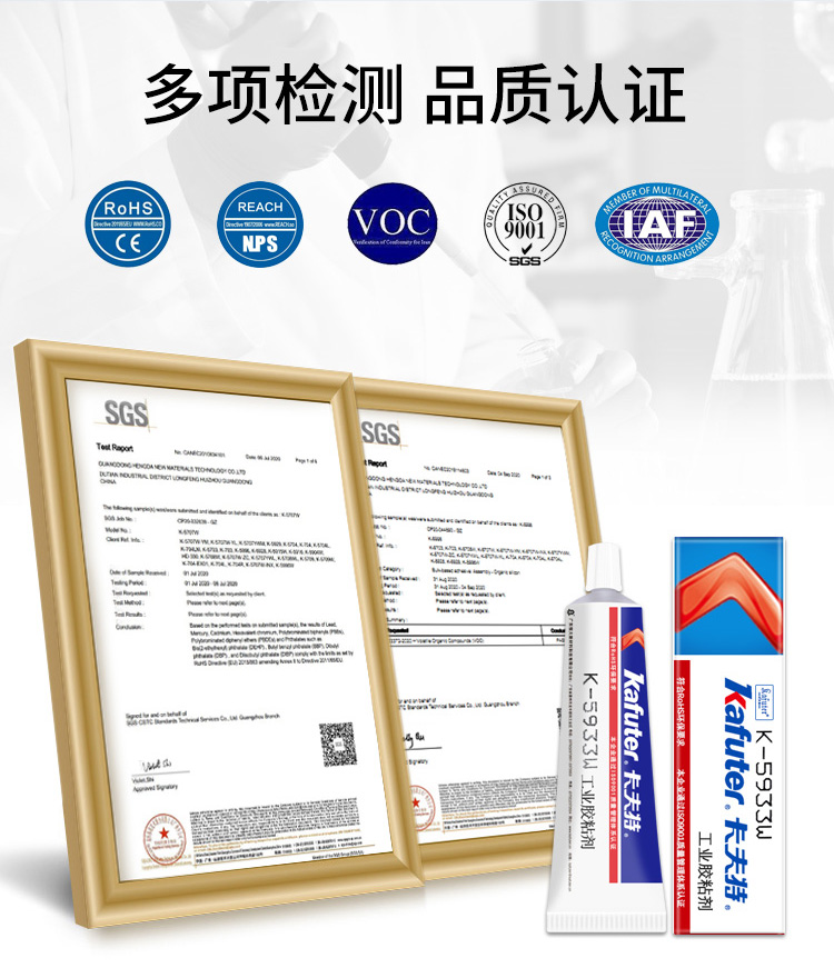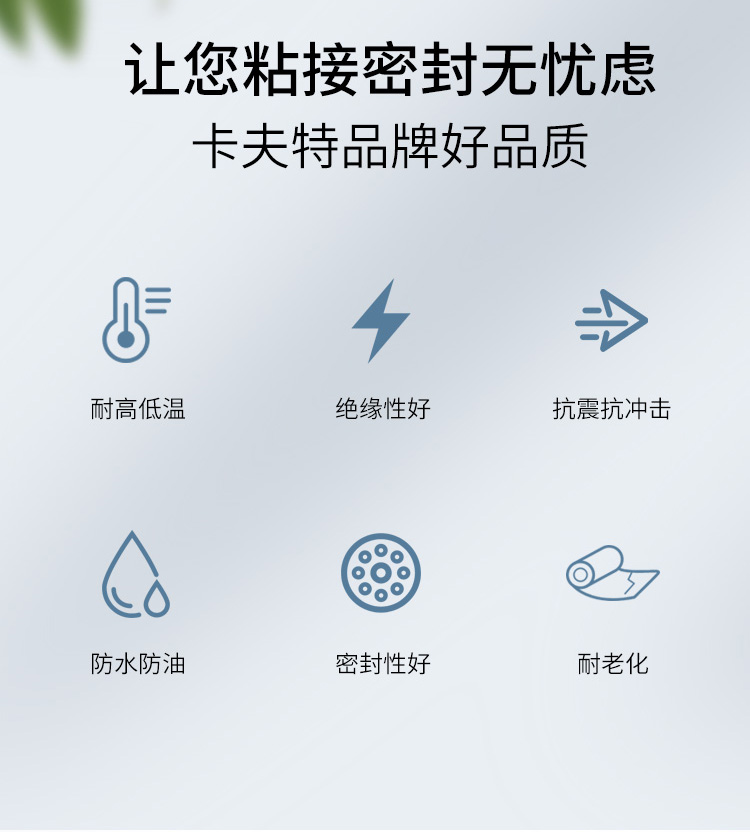 卡夫特工业胶粘剂K-5933B/W/T黑白电子电器元件粘接密封100克K-5933(单组分有机硅密封胶)系列为中等黏度室温固化单组份有机硅粘接密封胶,半流淌粘稠液体,本产品强度高,粘接性好,对铝、铜、不锈钢等多种金属有较好的粘接性;电性能优越,耐热性能好,一般使用温度范围-60℃~200℃。胶料对金属和大多数塑料的粘接性良好,固化后具有卓越的抗冷热交变性能。卡夫特Kafuter官方授权经销商-东莞德润密封材料有限公司www.gzderun.com,销售服务热线:15817734885,李经理