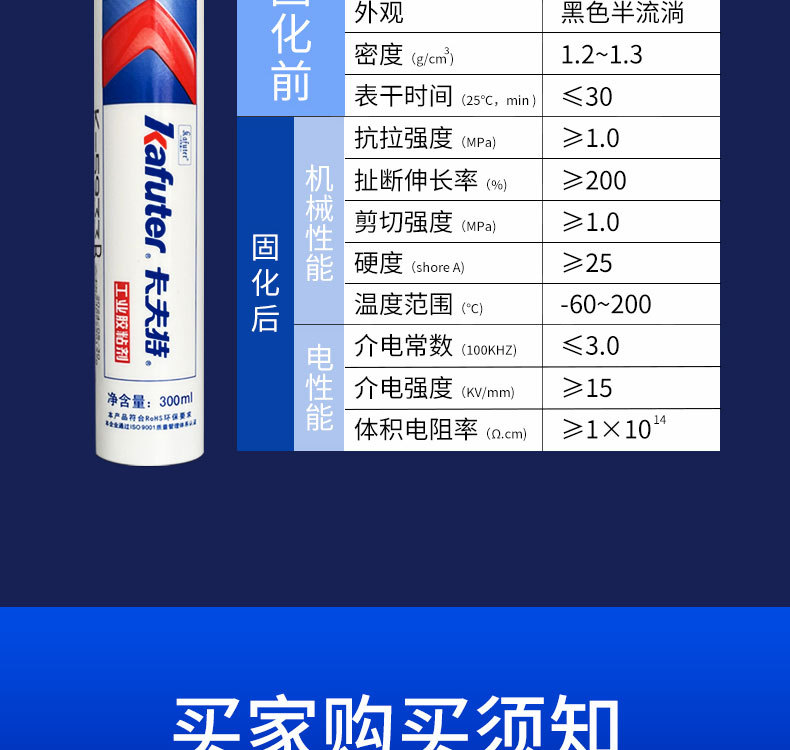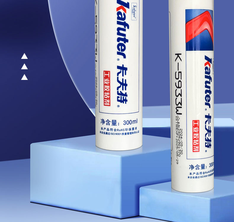 卡夫特K-5933W K-5933B K-5933T密封胶铝铜钢等金属粘接黑色透明K-5933(单组分有机硅密封胶)系列为中等黏度室温固化单组份有机硅粘接密封胶,半流淌粘稠液体,本产品强度高,粘接性好,对铝、铜、不锈钢等多种金属有较好的粘接性;电性能优越,耐热性能好,一般使用温度范围-60℃~200℃。胶料对金属和大多数塑料的粘接性良好,固化后具有卓越的抗冷热交变性能。卡夫特Kafuter官方授权经销商-东莞德润密封材料有限公司www.gzderun.com,销售服务热线:15817734885,李经理