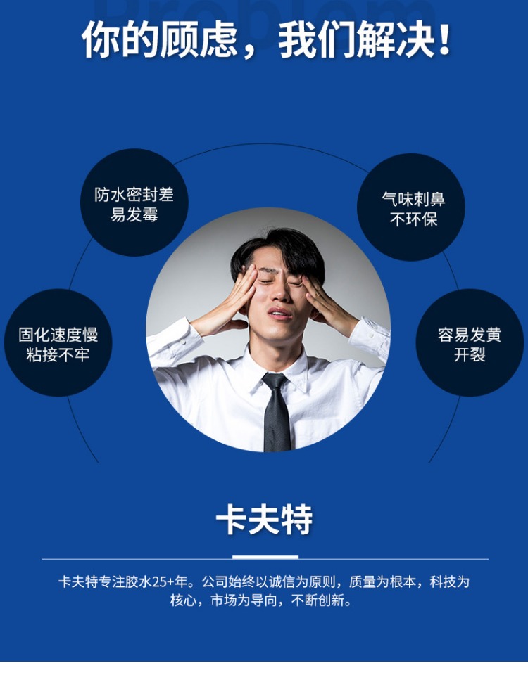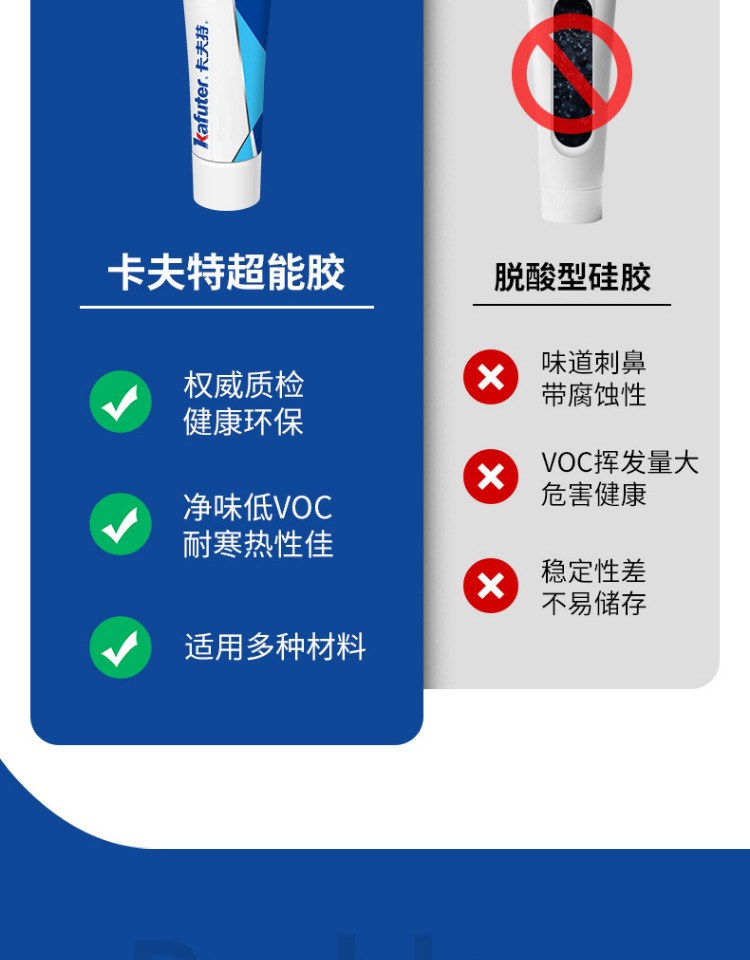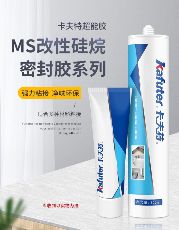 卡夫特K-6001W MS硅烷胶强力胶透明玻璃胶封边填缝车门堵漏密封胶K-6001系列是一种无溶剂类单组分室温湿气固化粘接密封胶,主要成分是甲硅烷基的特殊聚合物。常温露置于空气中快速固化。气味小,不腐蚀产品外观,具有初期粘接性好,粘度适中,操作方便。高性能,固化物韧性好,具有良好的耐久性和电气特性,耐振动、冲击的应力缓和性良好;耐高低温性能良好(-40℃~100℃)。适用材料广,粘结强度高,对于各种金属,塑料,橡胶,陶瓷等各种材料不要求做特殊表面处理便可获得优异的粘接效果。卡夫特Kafuter官方授权经销商-东莞德润密封材料有限公司www.gzderun.com,销售服务热线:15817734885,李经理