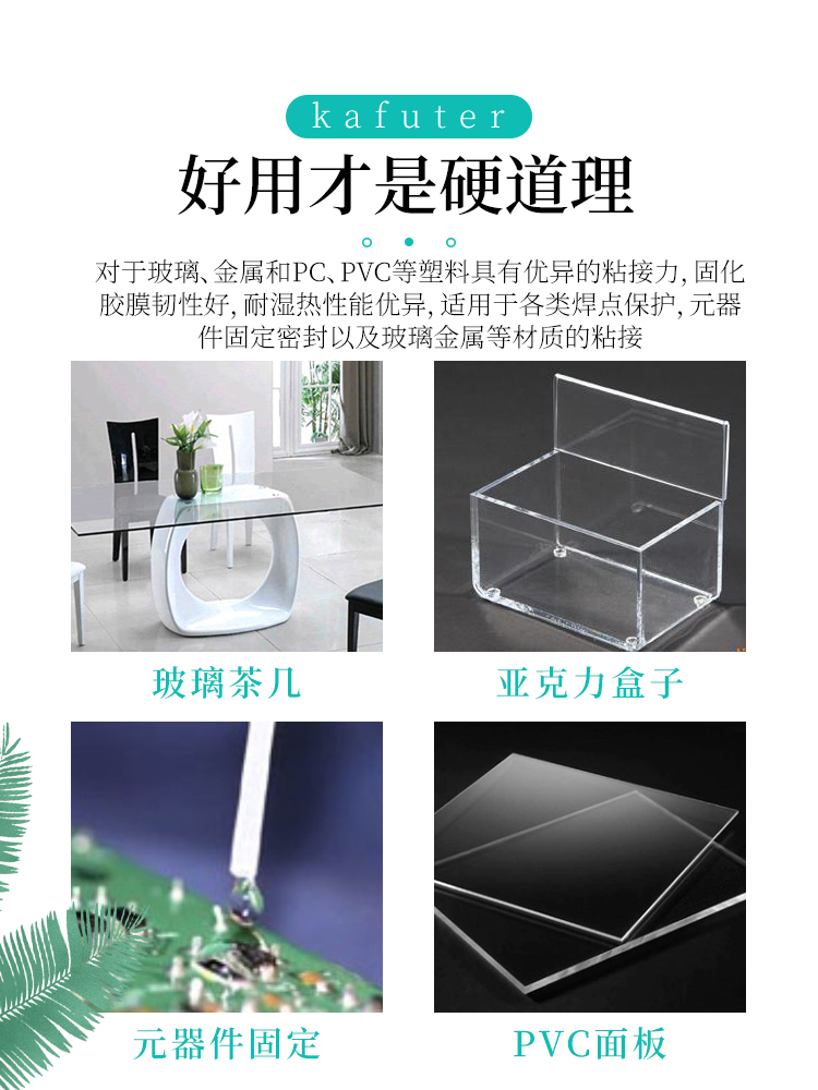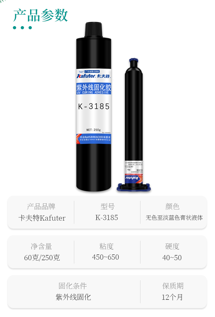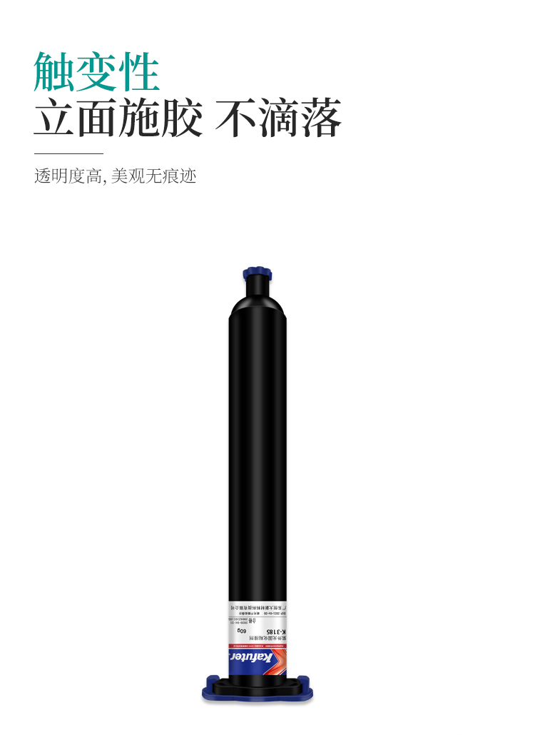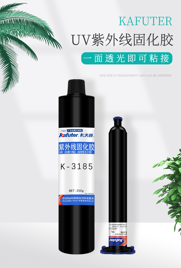 K-3185是单组分紫外光固化丙烯酸酯类胶粘剂,对于玻璃、金属和聚碳酸酯PC、聚氯乙烯PVC等塑料具有优异的粘接力,固化胶膜韧性好,耐湿热性能优异,适用于各类焊点保护,元器件固定密封以及玻璃金属等材质的粘接卡夫特Kafuter官方授权经销商-东莞德润密封材料有限公司www.gzderun.com,销售服务热线:15817734885,李经理