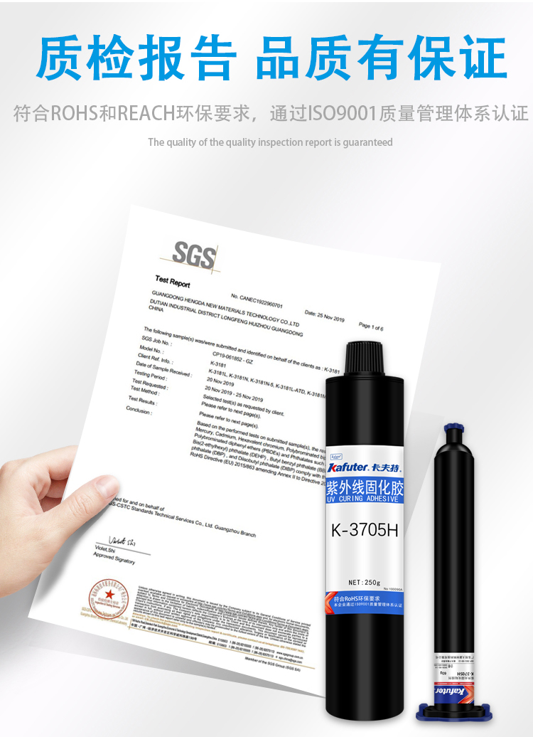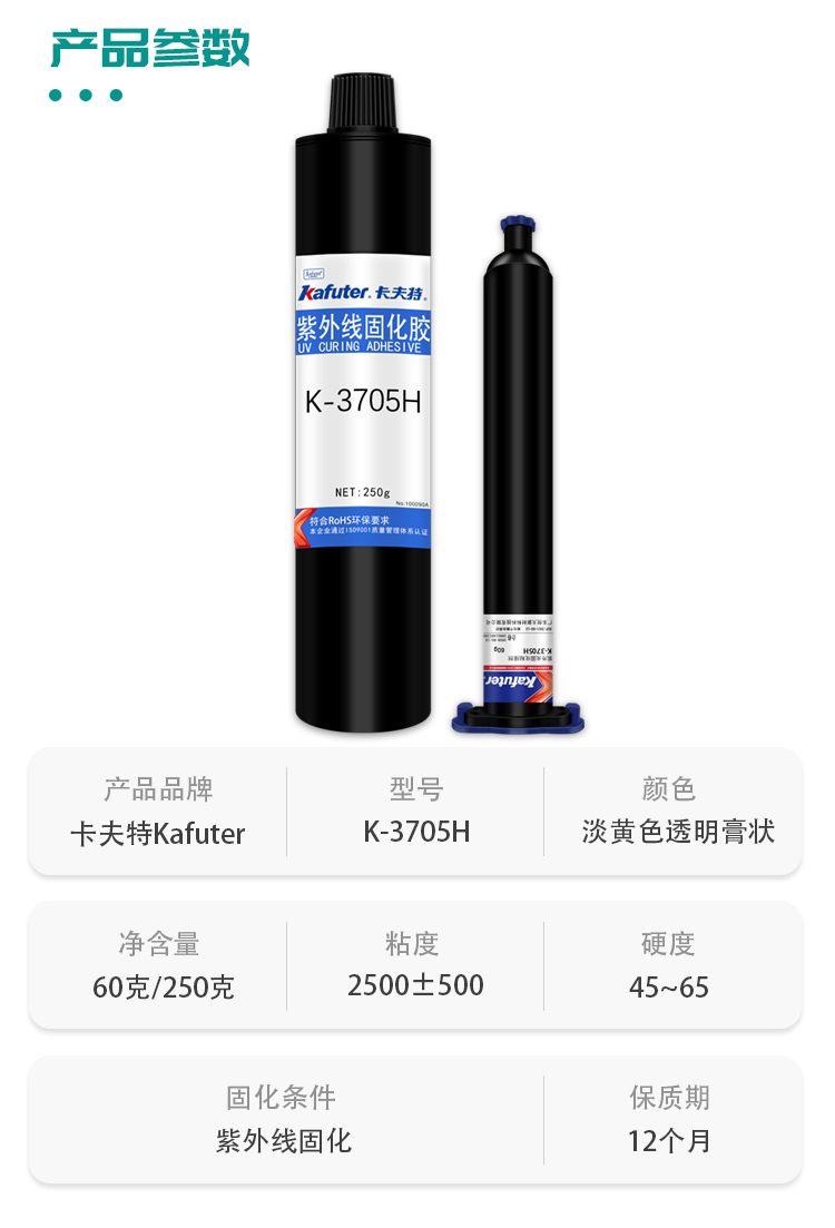 K-3705H是高触变通用型紫外光固化丙烯酸酯类胶粘剂。对常见塑料(PC、PVC和ABS等)、玻璃等材质都具有优异粘接力,针对应用改善了胶膜的韧性,适用于各种电子元器件的粘结固定。卡夫特Kafuter官方授权经销商-东莞德润密封材料有限公司www.gzderun.com,销售服务热线:15817734885,李经理