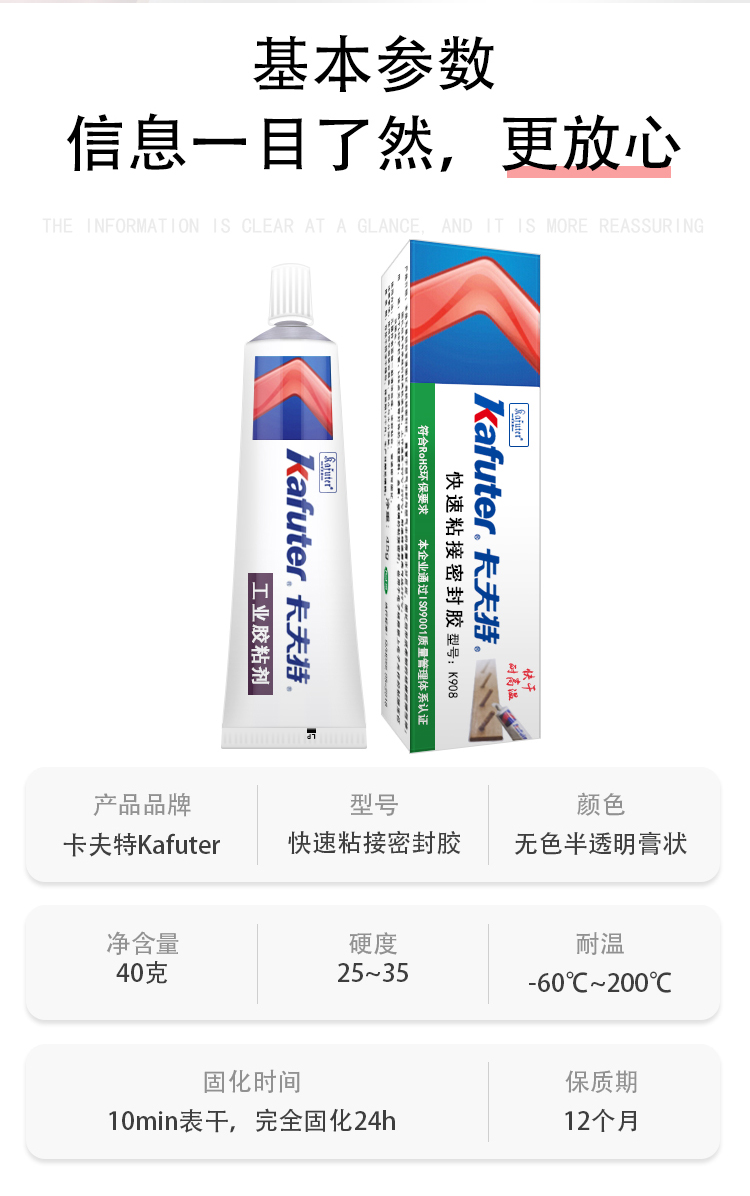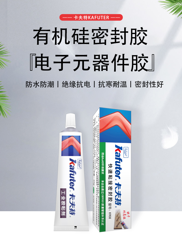 卡夫特K908快速粘接密封胶是一种可进行快速粘接的有机硅胶粘剂,绝缘性优、粘接性好,防潮、抗震、耐电晕、抗漏电。胶料对金属和大多数塑料的粘接性良好,固化后具有卓越的抗冷热交变性能(-60~200℃)。