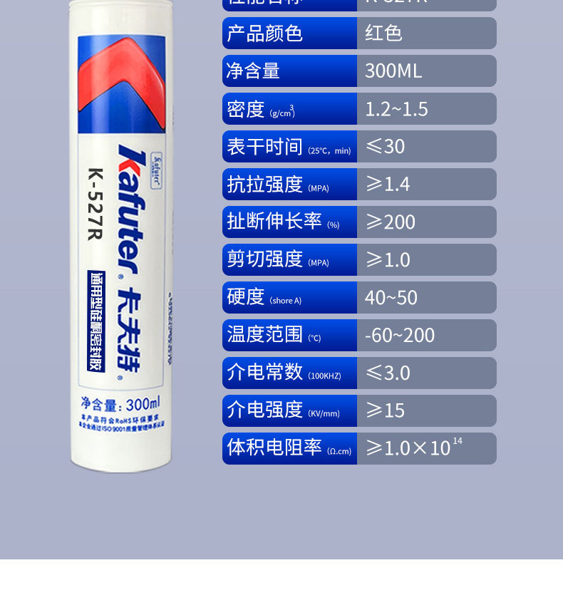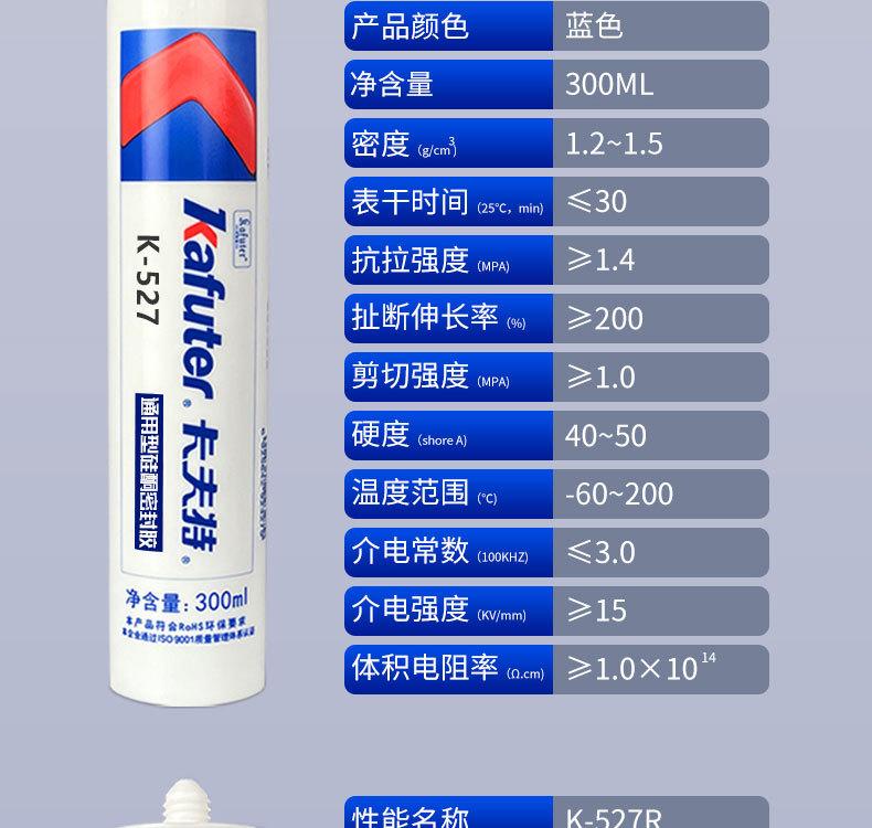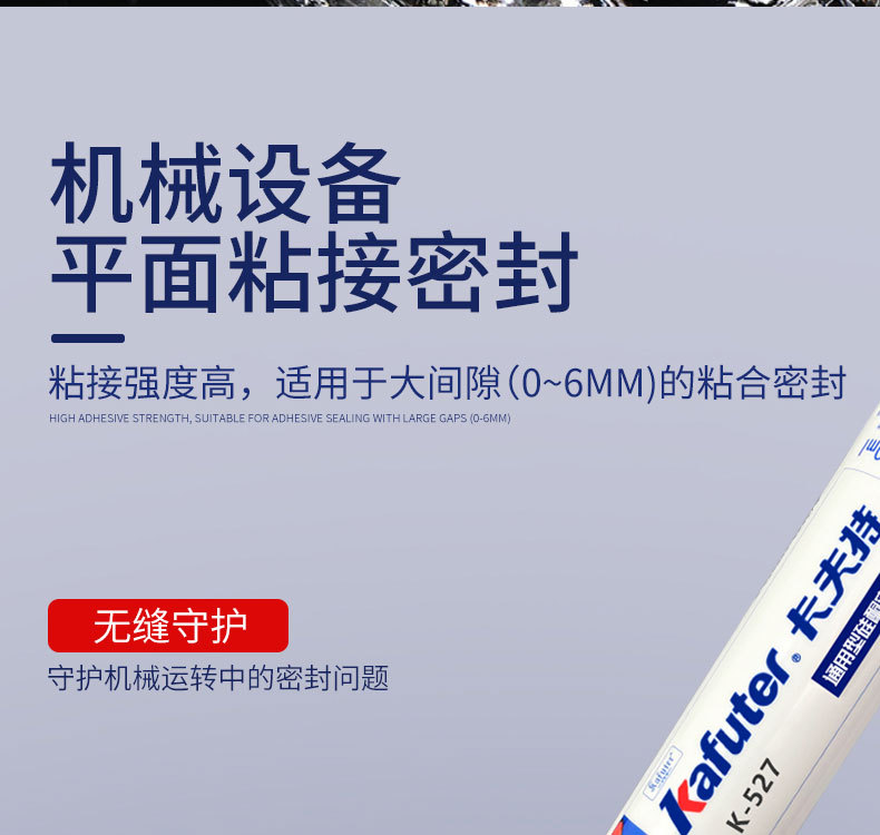 K-527(室温固化硅橡胶)是一种酮肟型单组分RTV型硅橡胶,高粘度、触变性好、中性无腐蚀,具有耐高温、高压、耐溶剂、低收缩、无塌陷等特性。适用于大间隙(0~6mm)的粘合密封,可防水、防油、抗冲击、振动。产品有蓝色,红色,黑色,灰色,白色可供选择。卡夫特Kafuter官方授权经销商-东莞德润密封材料有限公司www.gzderun.com,销售服务热线:15817734885,李经理
