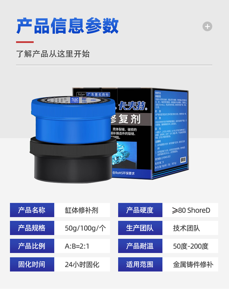 k-9120缸体修复剂用于金属缸体、壳体裂缝、破损的粘接,修补修复,也可填补铸造件的裂缝,砂眼、气孔、麻坑等缺陷。卡夫特Kafuter官方授权经销商-东莞德润密封材料有限公司