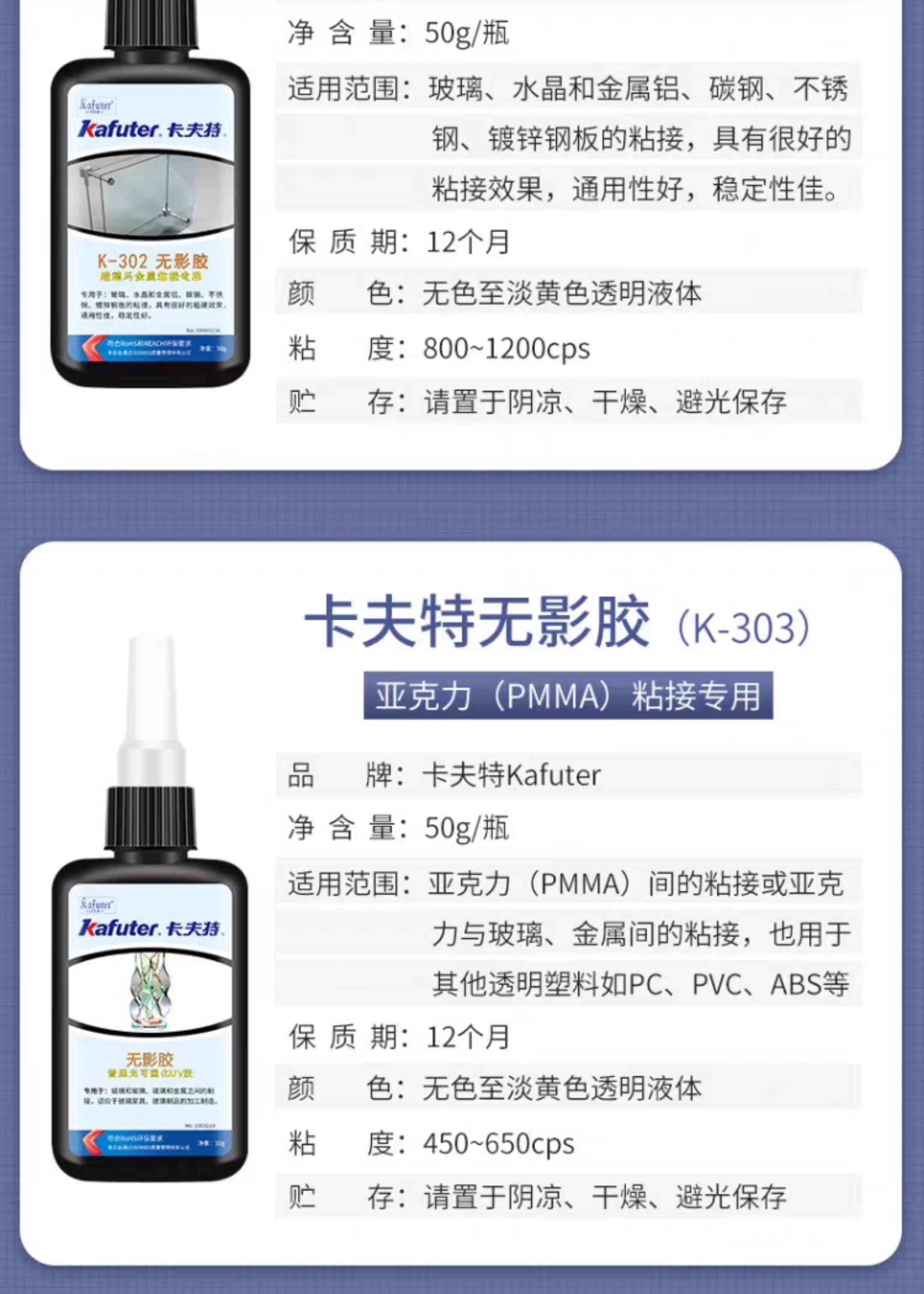 K-303粘塑料/塑料、塑料/玻璃、塑料/金属黏接UV胶是一种单组分紫外光及可见光固化改性丙烯酸酯胶粘剂,柔韧性好,用于透明塑料如PC、PMMA、PET、PVC、ABS、PS等的自粘或互粘,也用于塑料与金属、塑料与玻璃的粘接。黏卡夫特Kafuter官方授权经销商-东莞德润密封材料有限公司www.gzderun.com,销售服务热线:15817734885,李经理