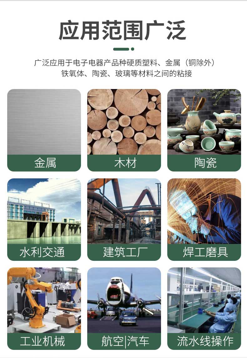 用途:泛用于金属和石材的自粘或互粘,用于硬质材料的粘接和修补,建筑材料粘接。