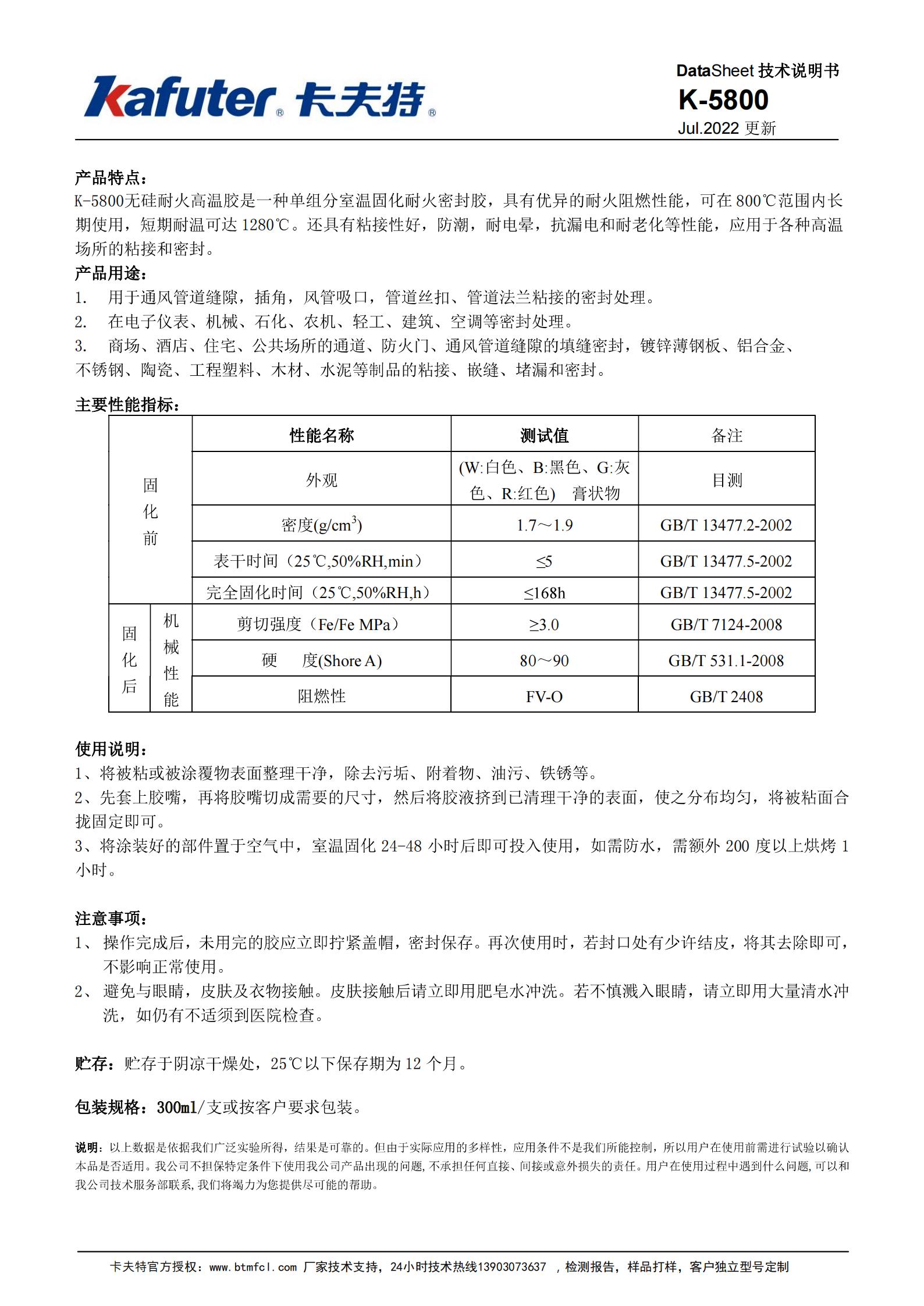 K-5800耐火高温胶是一种单组分室温固化耐火密封胶,具有优异的耐火阻燃性能,可在800C范围内长期使用,短期耐温可达1280C。还具有粘接性好,防潮,耐电晕,抗漏电和耐老化等性能,应用于各种高温场所的粘接和密封。卡夫特Kafuter官方授权经销商-东莞德润密封材料有限公司www.gzderun.com,销售服务热线:15817734885,李经理