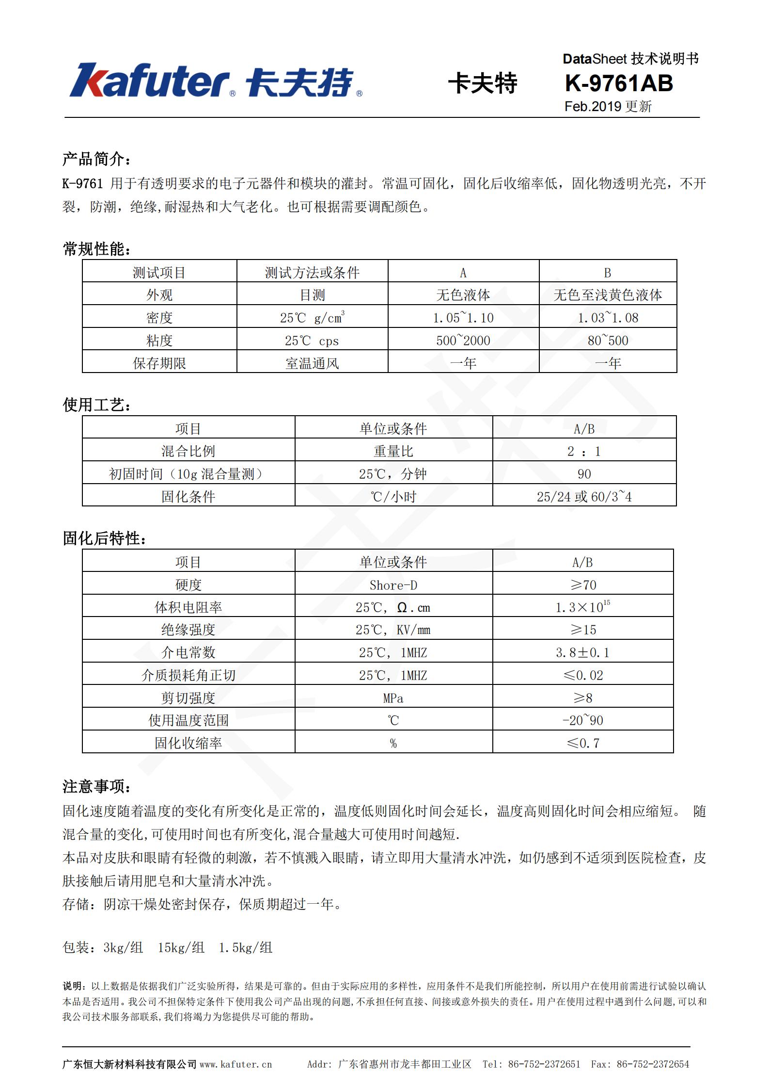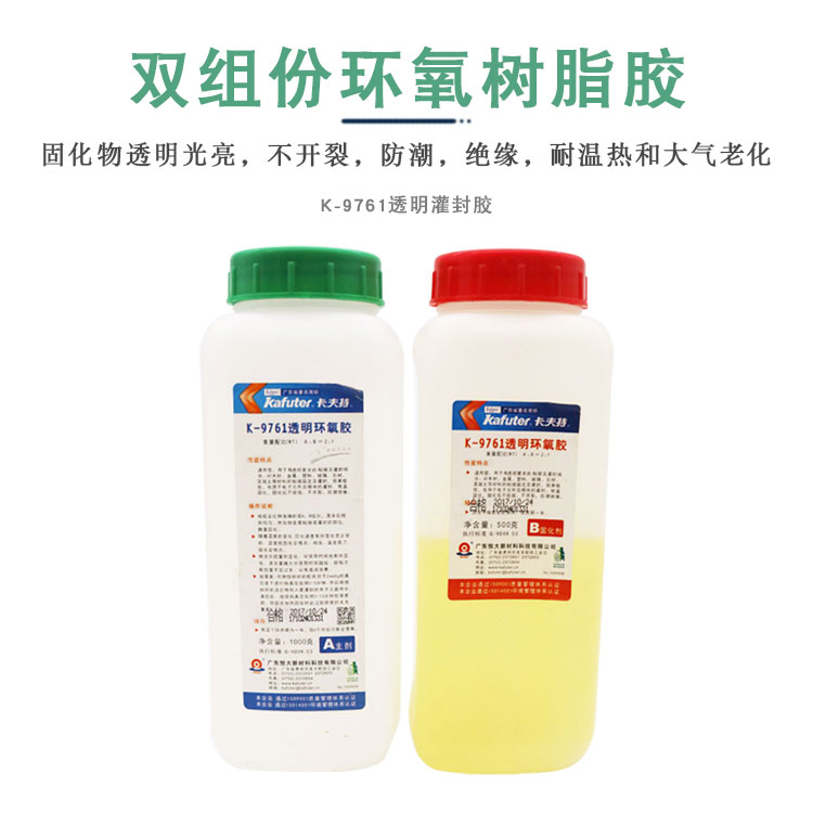 K-9761用于有透明要求的电子元器件和模块的灌封。常温可固化,固化后收缩率低,固化物透明光亮,不开裂,防潮,绝缘,耐湿热和大气老化。也可根据需要调配颜色。