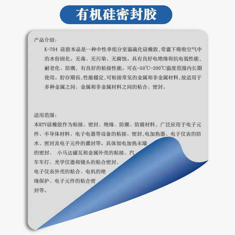 本品为单组份室温固化有机硅密封胶,露置于空气中时与空气中微量水分反应,司化后形成柔韧的硅橡胶弹性体。固化后具有优秀的耐高低温性能,工作温度-50℃~200
