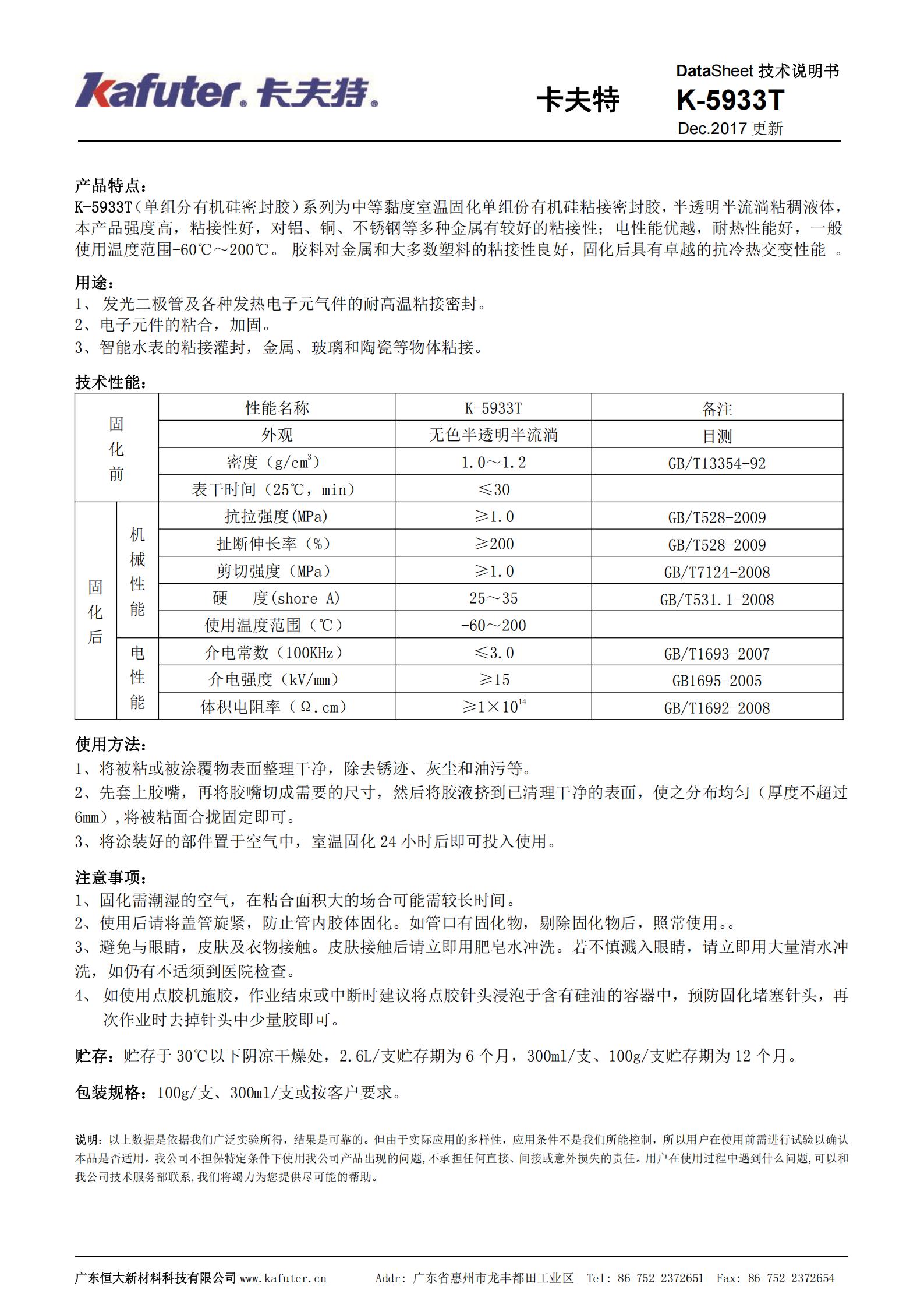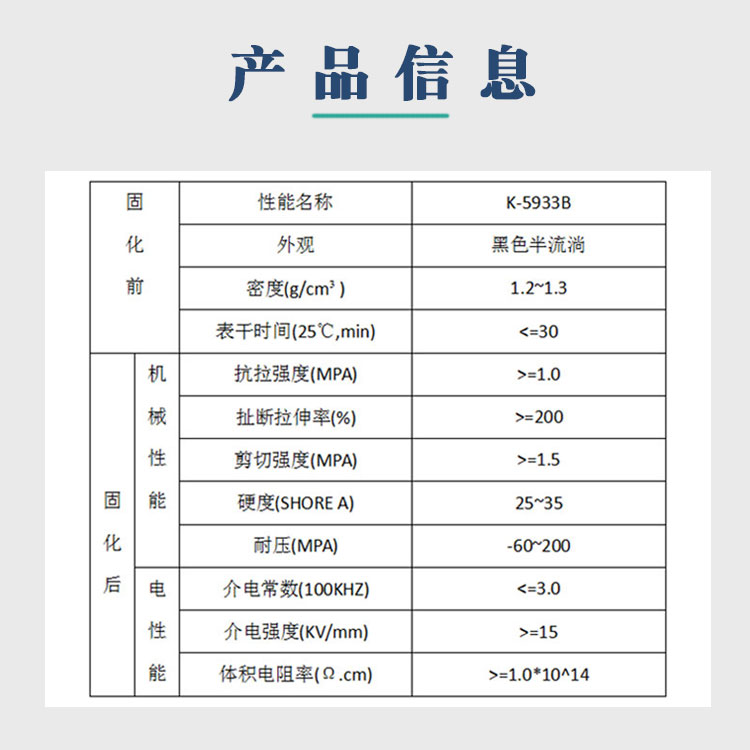 K-5933(单组分有机硅密封胶)系列为中等黏度室温固化单组份有机硅粘接密封胶,半流淌粘稠液体,本产品强度高,粘接性好,对铝、铜、不锈钢等多种金属有较好的粘接性;电性能优越,耐热性能好,一般使用温度范围-60℃~200