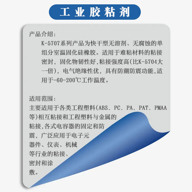 K-5707T|5707B|5707W工程塑料密封胶系列密封硅胶为快干型无溶剂的单组分室温固化硅橡胶,适用于难粘材料的粘接密封,固化物韧性好,粘接强度高,固化后具有良好的抗冷热交变性能,耐温性好(-60~+200℃),电气绝缘性优,具有防潮防震功能。卡夫特Kafuter官方授权经销商-东莞德润密封材料有限公司