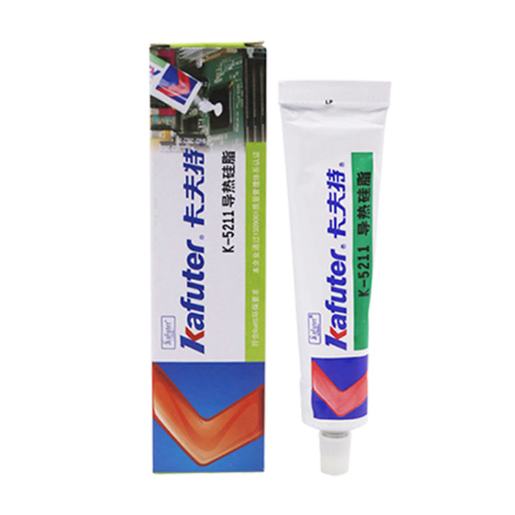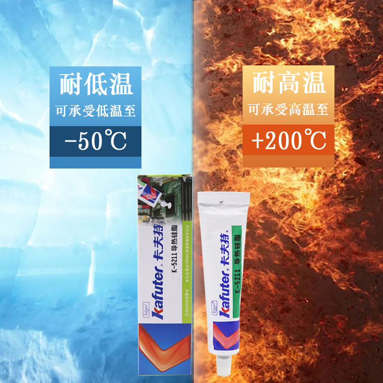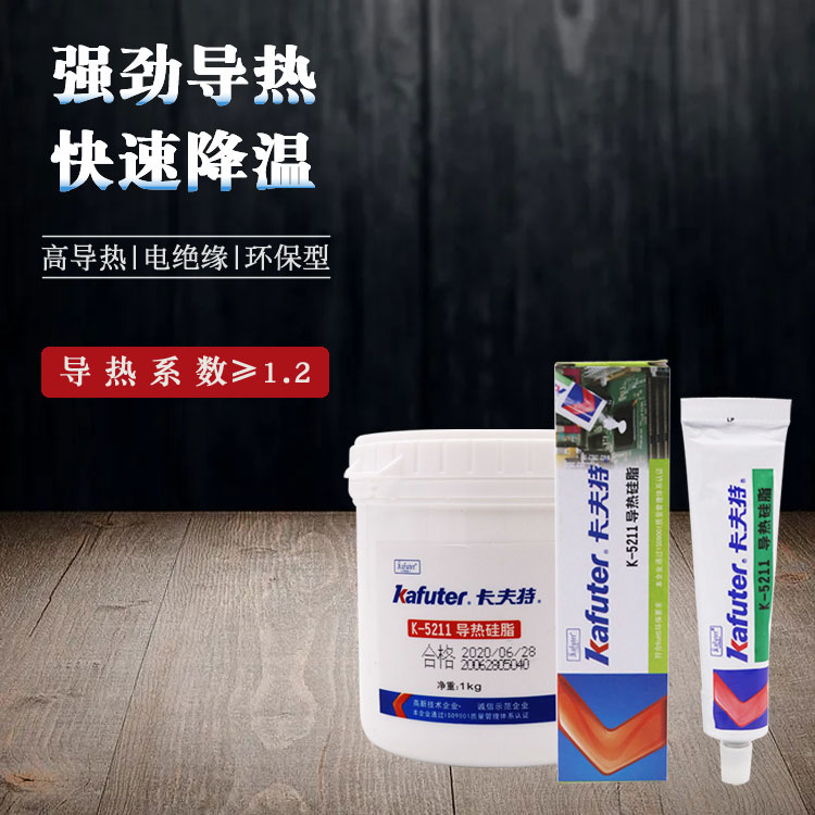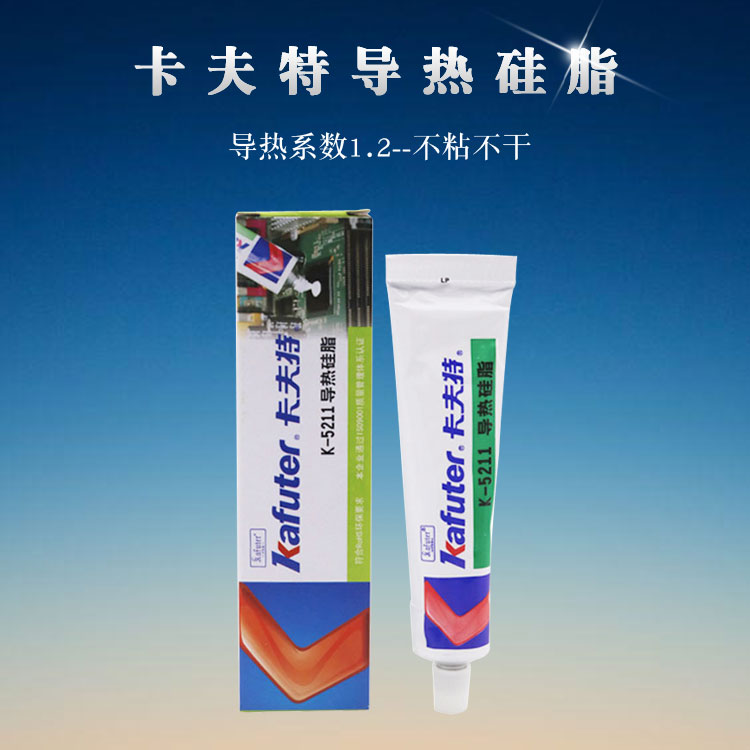 K-5211/5211H导热硅脂[1.2w/m.k]导热硅脂采用进口原料配方生产,使用导热性和绝缘性良好的金属氧化物与有机硅氧烷复合而成的膏脂状物。产品具有良好的导热性和电绝缘性,较宽的使用温度(工作温度-50℃~+200℃)很好的使用稳定性,较低的稠度和良好的施工性能。卡夫特Kafuter官方授权经销商-东莞德润密封材料有限公司