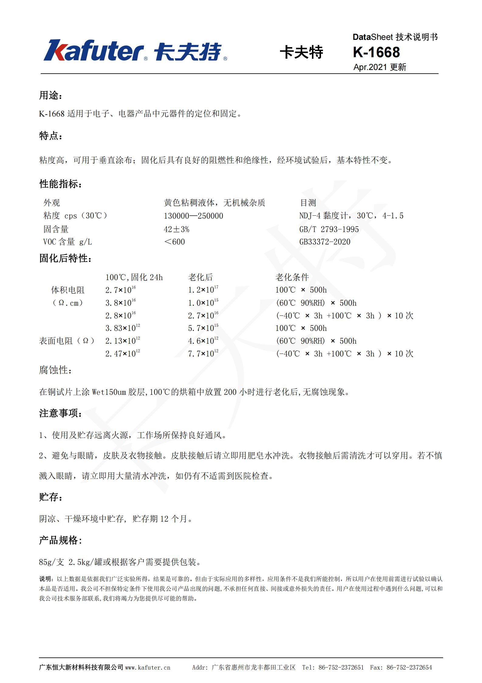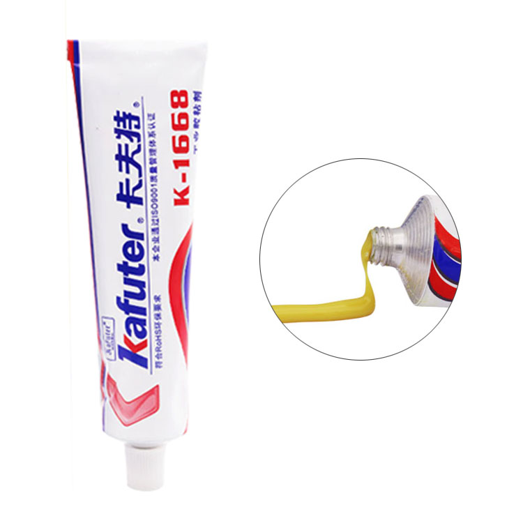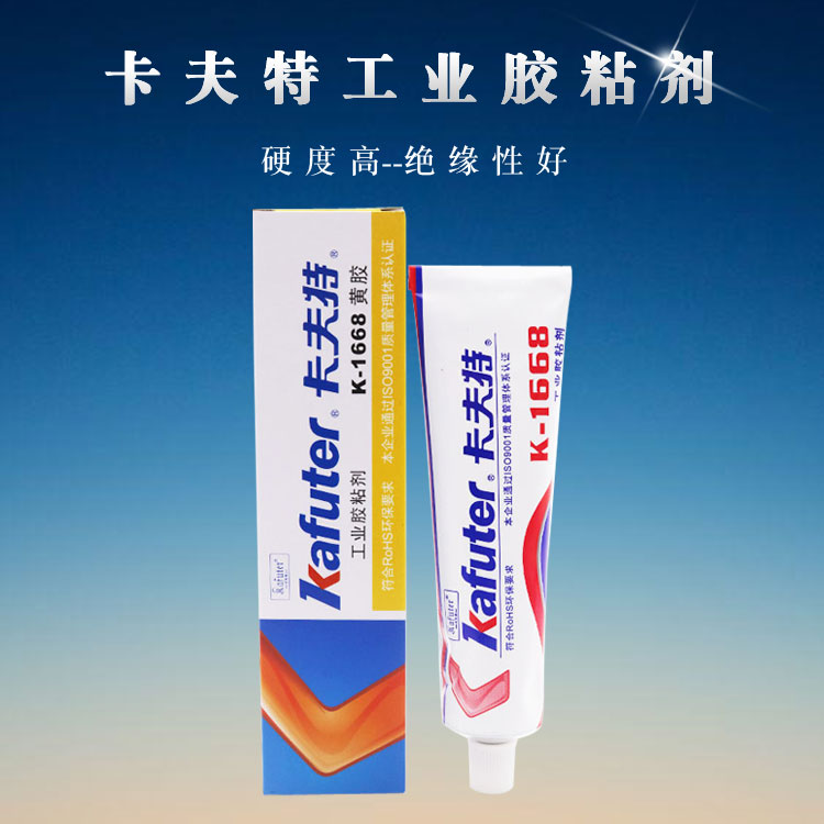 卡夫特K-1668黄胶适用于电子、电器产品中元器件的定位和固定。粘度高, 可用于垂直涂布; 固化后具有良好的阻燃性和绝缘性,经环境试验后,基本特性不变。