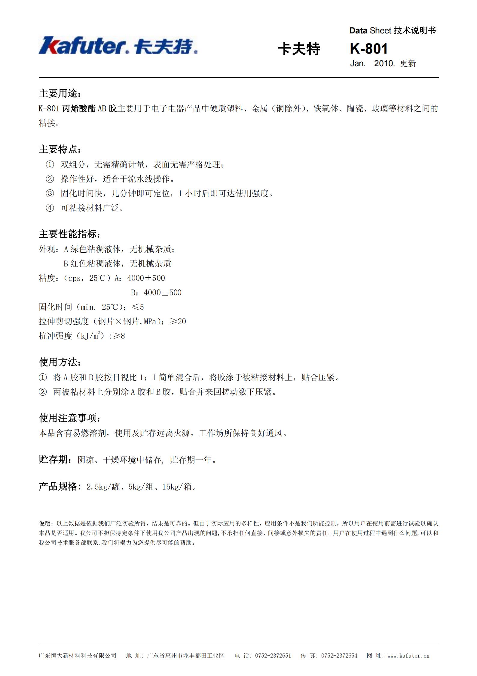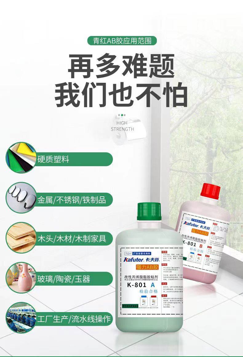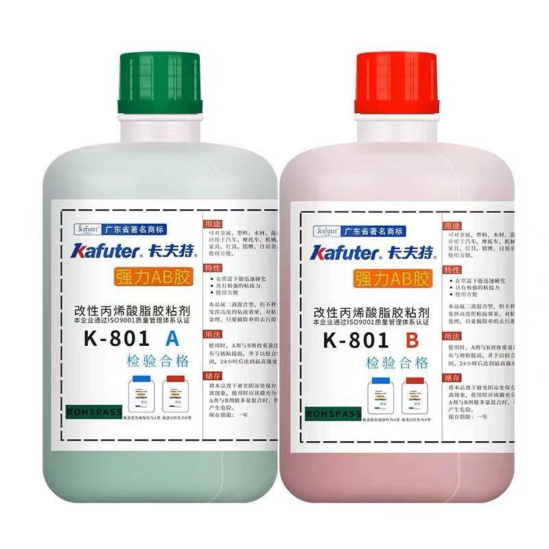 K-801是双组分改性丙烯酸酯结构胶;粘度适中,操作方便,适合流水线作业;可粘接材料普遍;固化速度快,几分钟可定位,1小时后可达使用强度;强度高,耐候性佳。产品符合RoHS,VOC等标准要求。卡夫特Kafuter官方授权经销商-东莞德润密封材料有限公司
