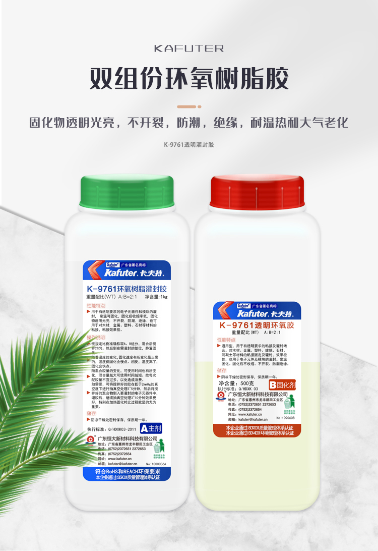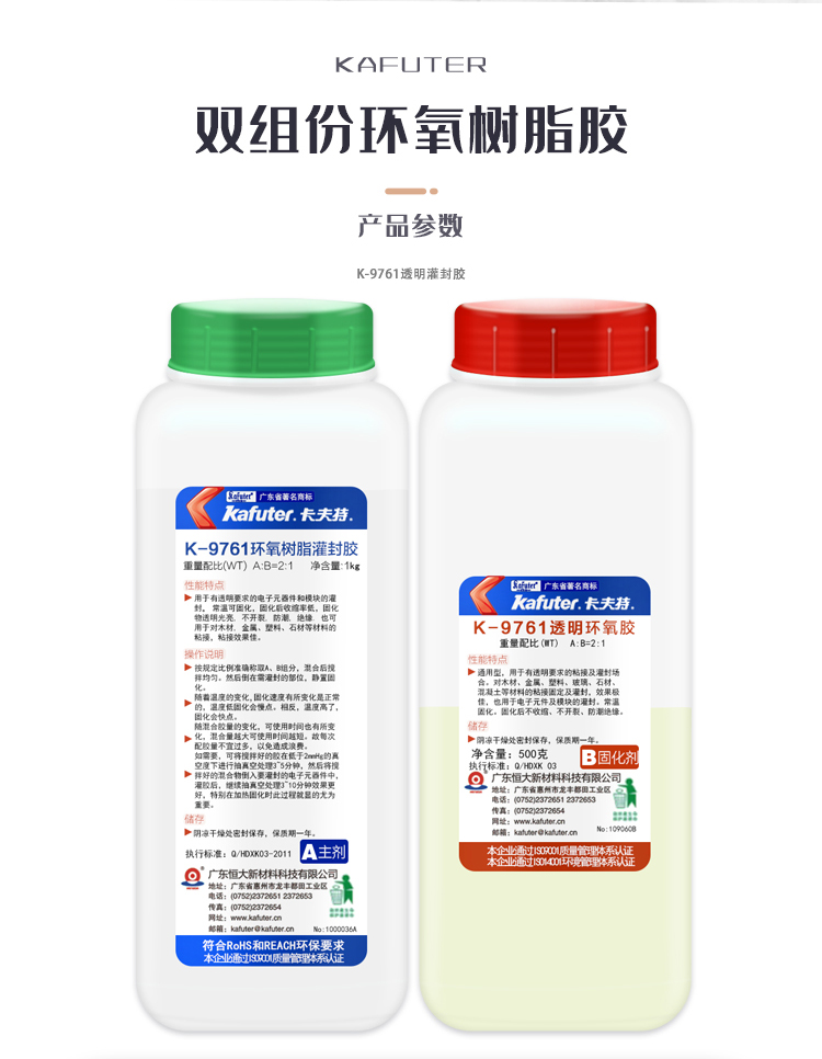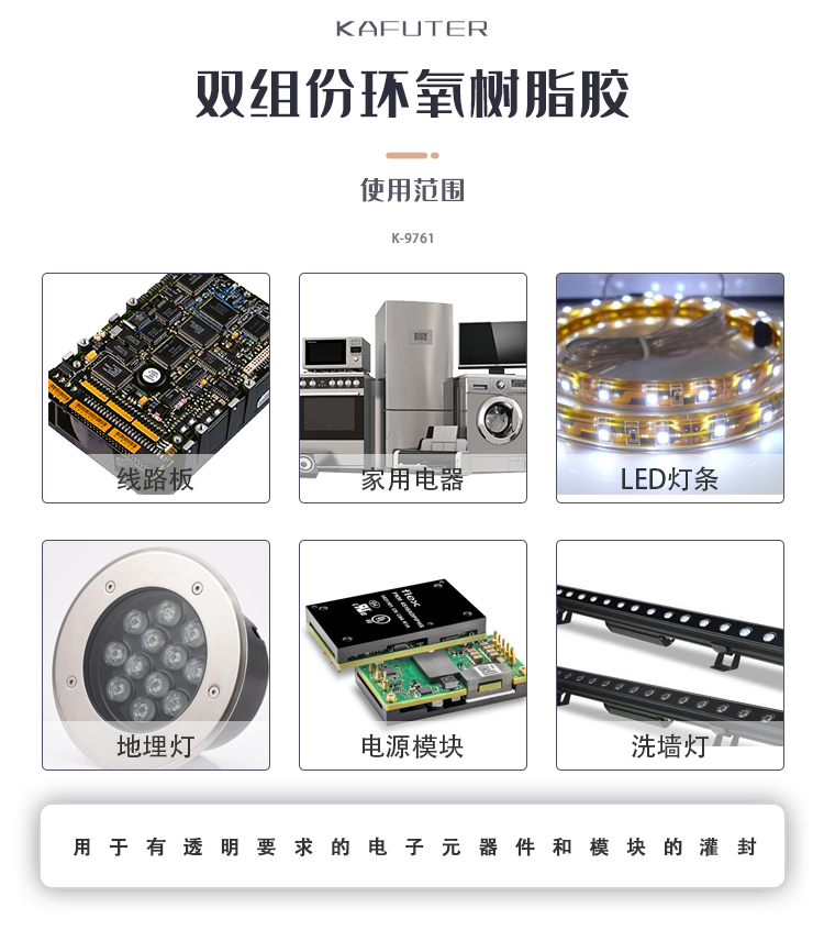 K-9761用于有透明要求的电子元器件和模块的灌封。常温可固化,固化后收缩率低,固化物透明光亮,不开裂,防潮,绝缘,耐湿热和大气老化。也可根据需要调配颜色。卡夫特Kafuter官方授权经销商-东莞德润密封材料有限公司