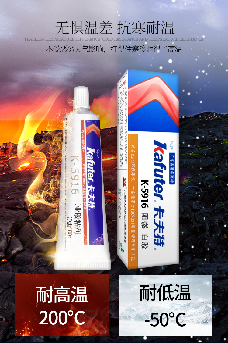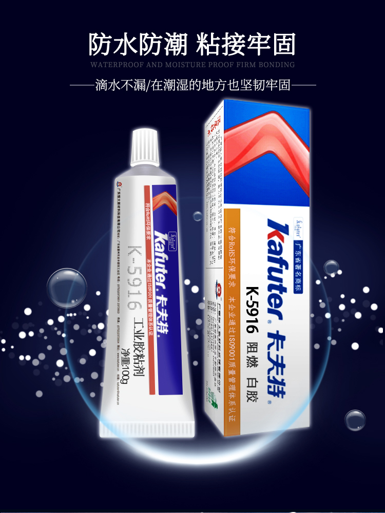 卡夫特 K-5916白胶卡夫特K-5916是一种单组份室温固化的阻燃型有机硅胶粘剂,阻燃性好:阻燃性能达到UL 94 V - 0级别,UL证书号:E335921。 适用范围广:胶料对金属和大多数塑料的粘接性良好,与一般有机硅粘合剂相比,具有对基材更好的粘附性、防潮性能。主要用于电子电器元器件的固定及阻燃、绝缘密封防水,如电源供应器的接着与填充密封,也可用于其它多种阻燃密封用途。卡夫特Kafuter官方授权经销商-东莞德润密封材料有限公司www.gzderun.com,销售服务热线:15817734885,李经理