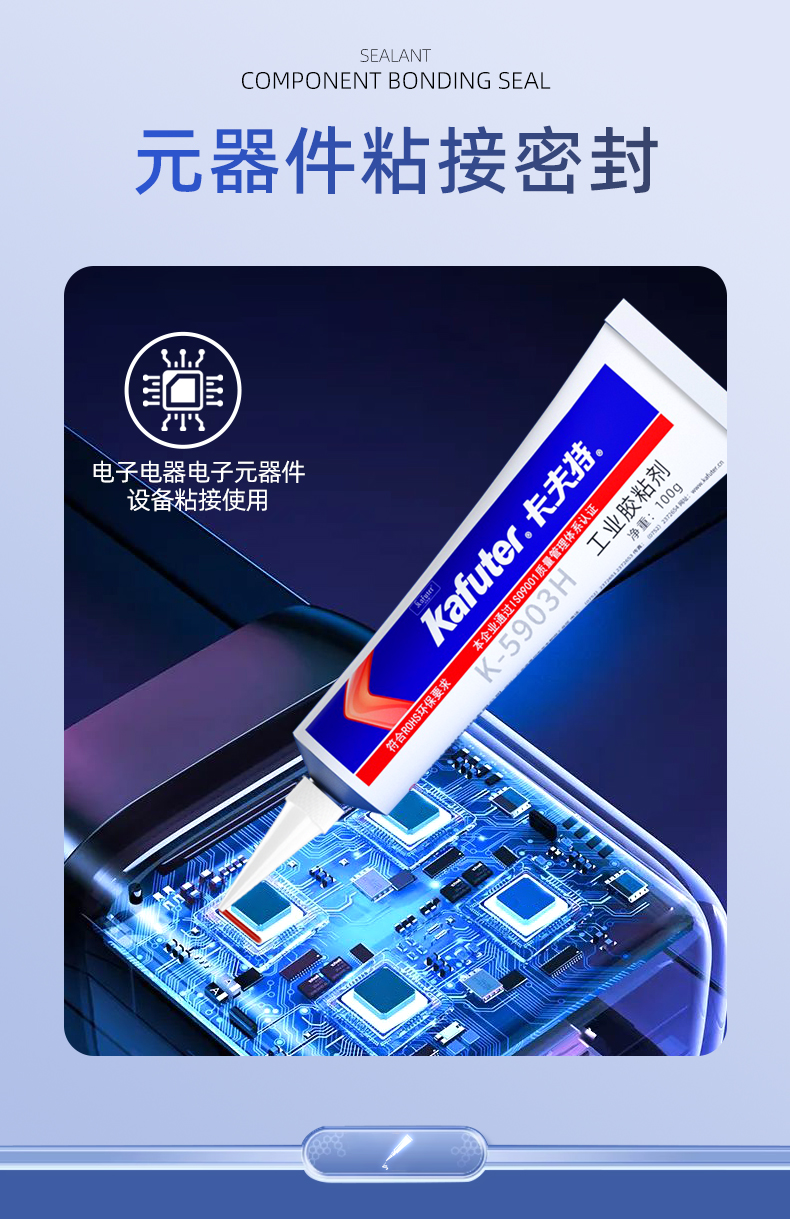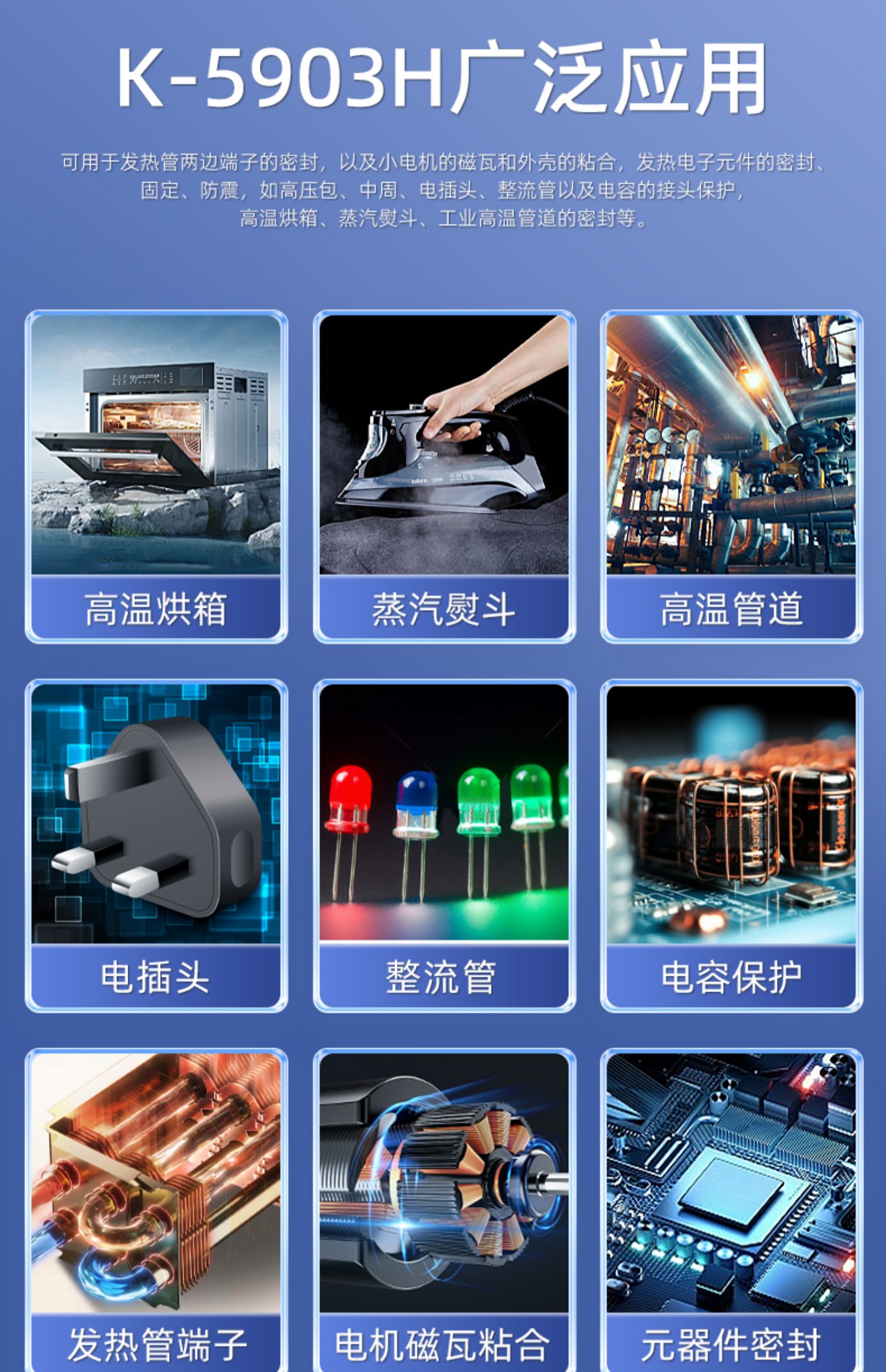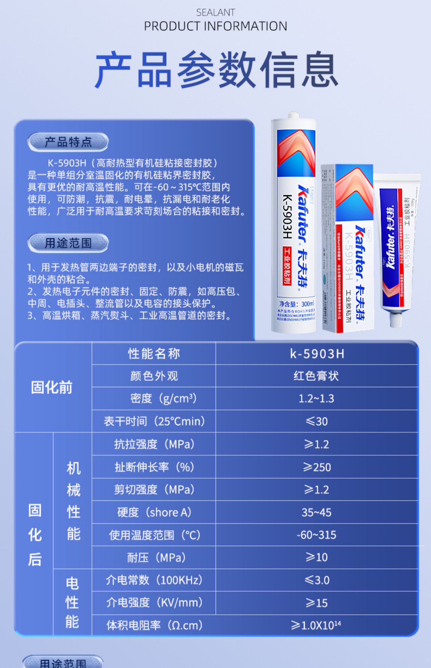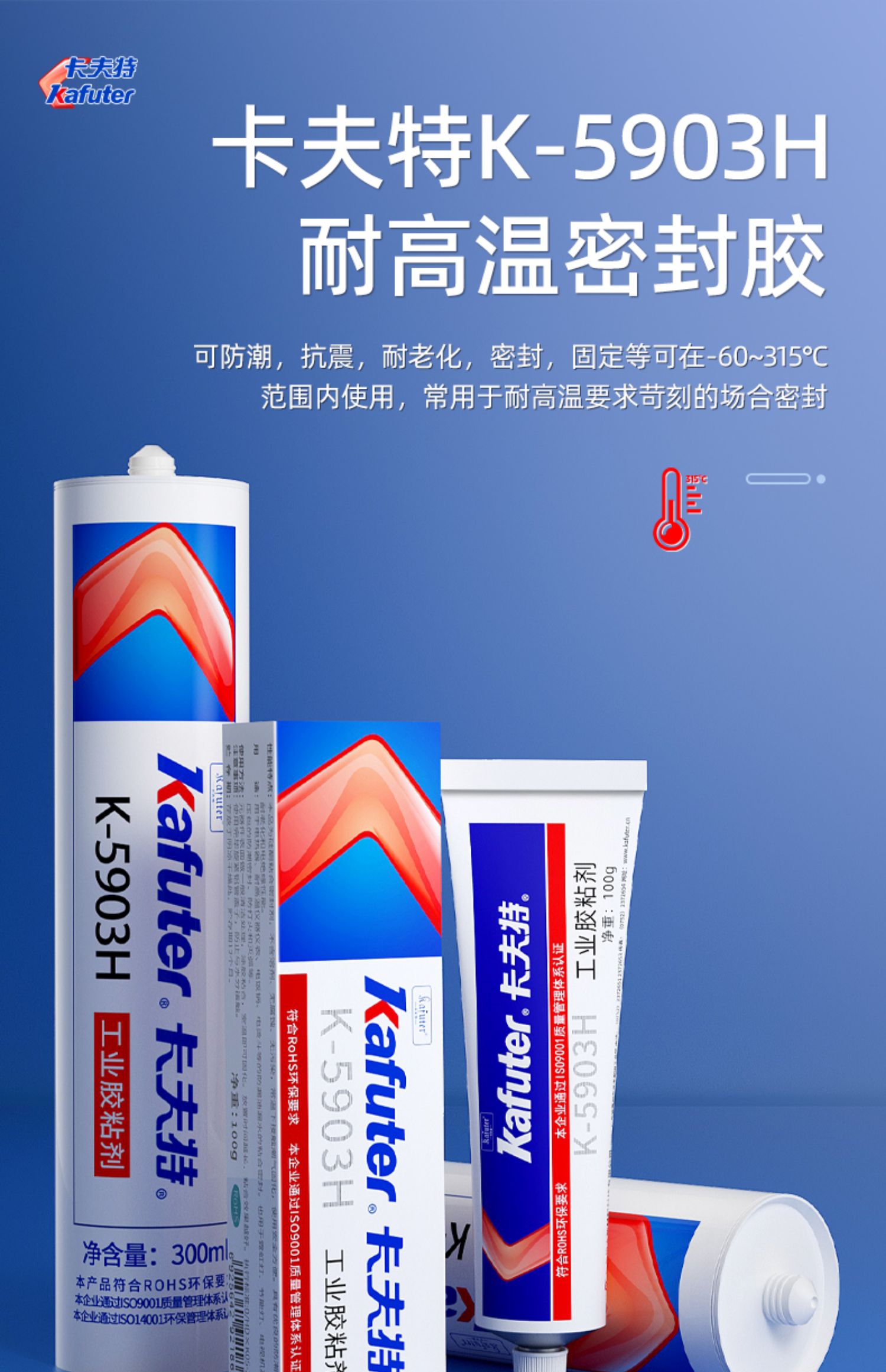K-5903/5903H(高耐热型有机硅粘接密封胶)是一种单组分室温固化的有机硅粘界密封胶,具有更优的耐高温性能。可在-60~315C范围内使用,可防潮,抗震,耐电晕,抗漏电和耐老化性能,普遍用于耐高温要求苛刻场合的粘接和密封。卡夫特Kafuter官方授权经销商-东莞德润密封材料有限公司