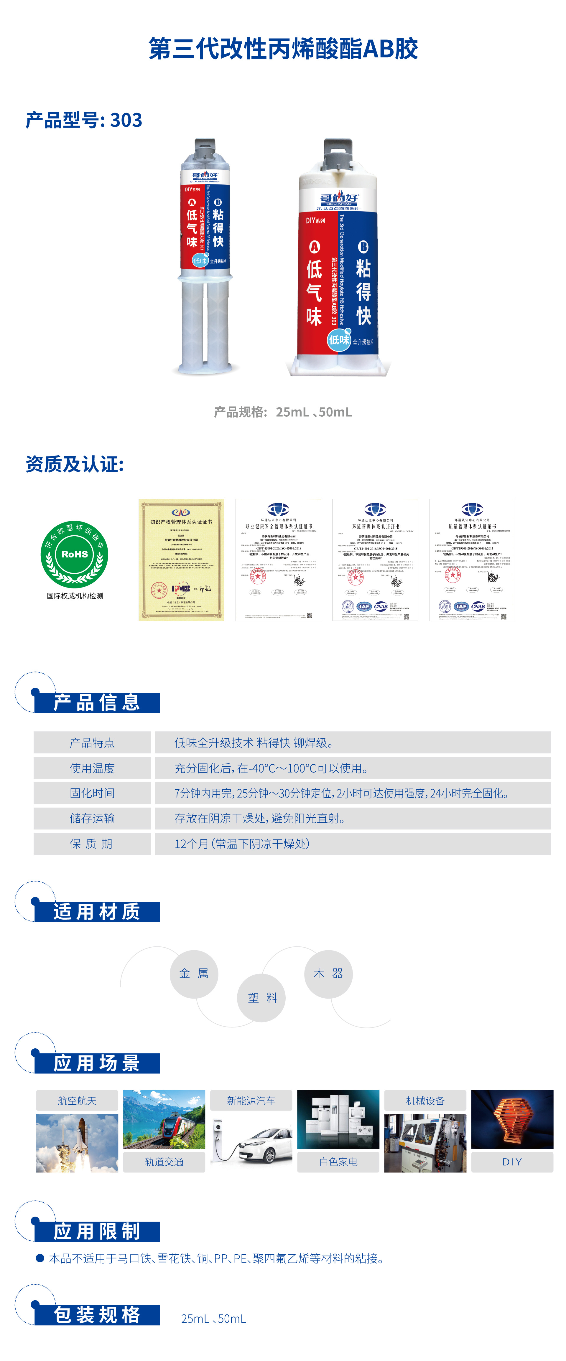 - 型号定位:303为哥俩好中高强度胶粘剂系列,适用于金属、陶瓷、硬质塑料等材料的快速粘接与修复。