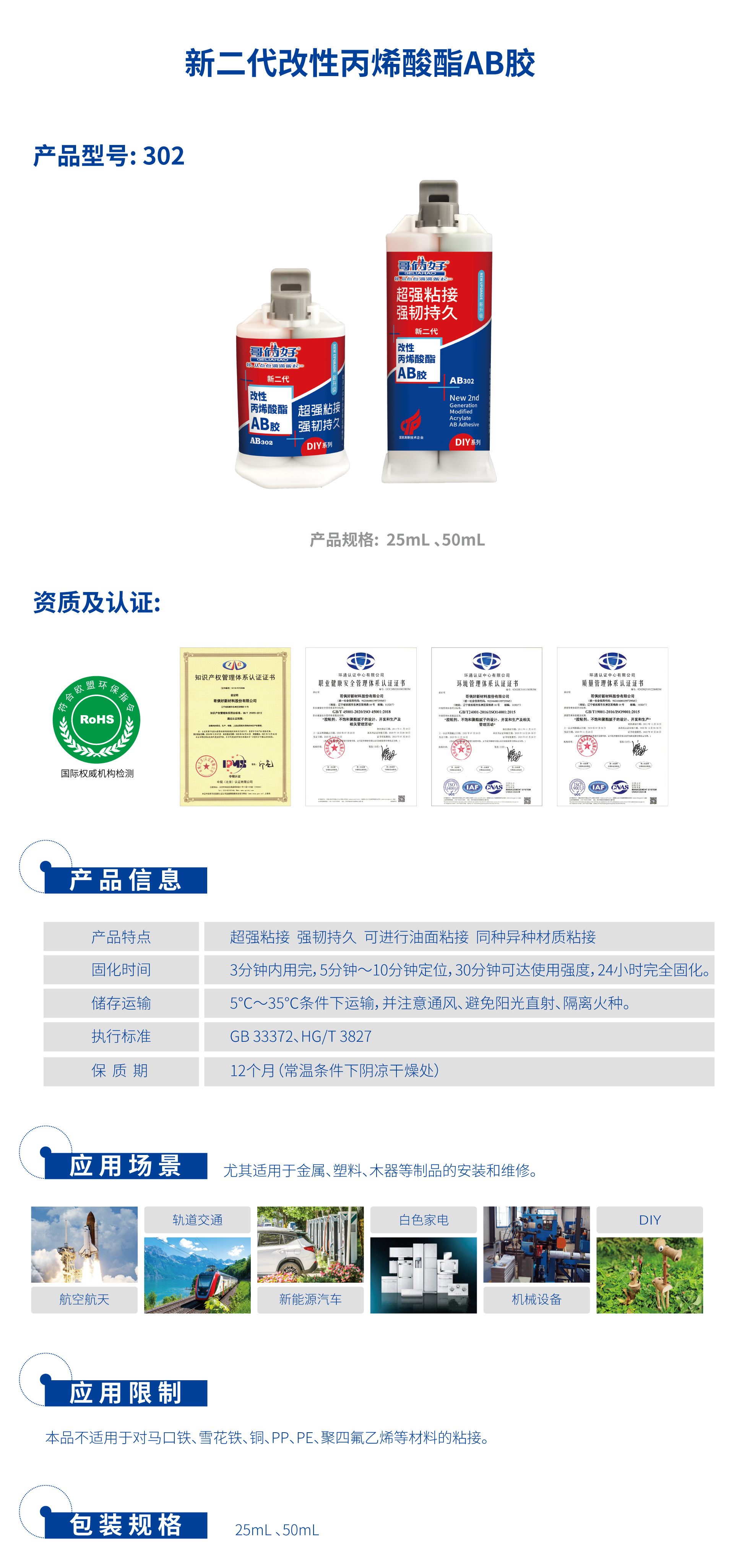 - 型号迭代:302二代是哥俩好302胶的升级版本,主打高强度快速修复,适用于金属、陶瓷、硬塑料等材料的应急粘接。