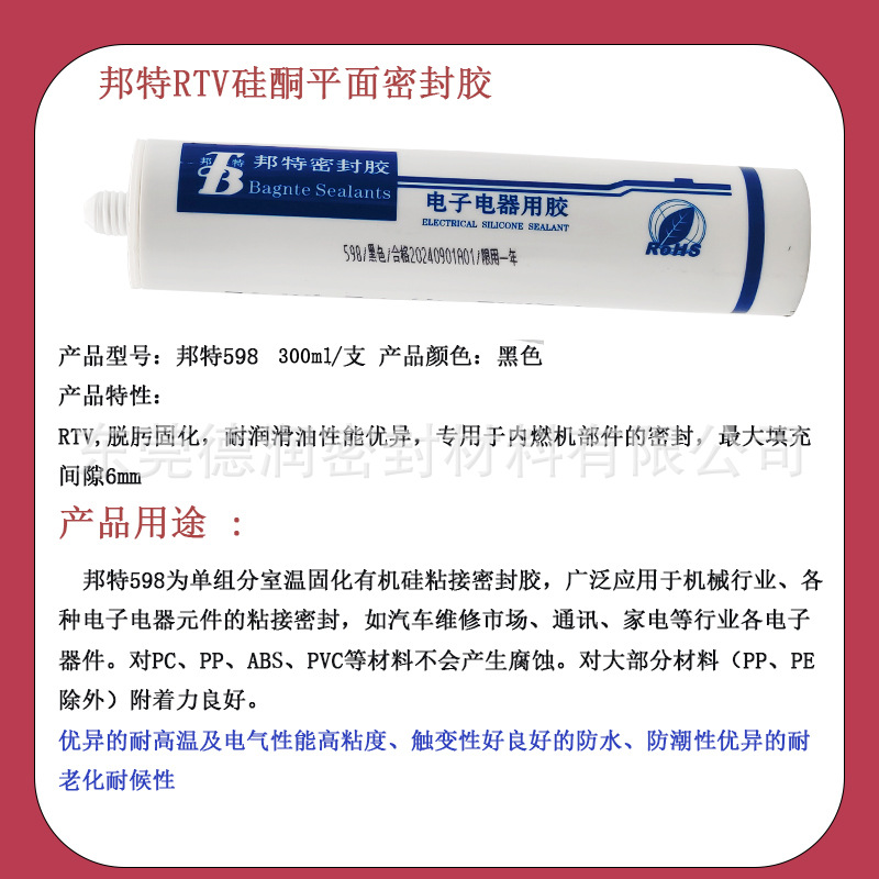邦特598有机硅密封胶防水汽车大灯发动机油底壳硅酮密封胶水300ml