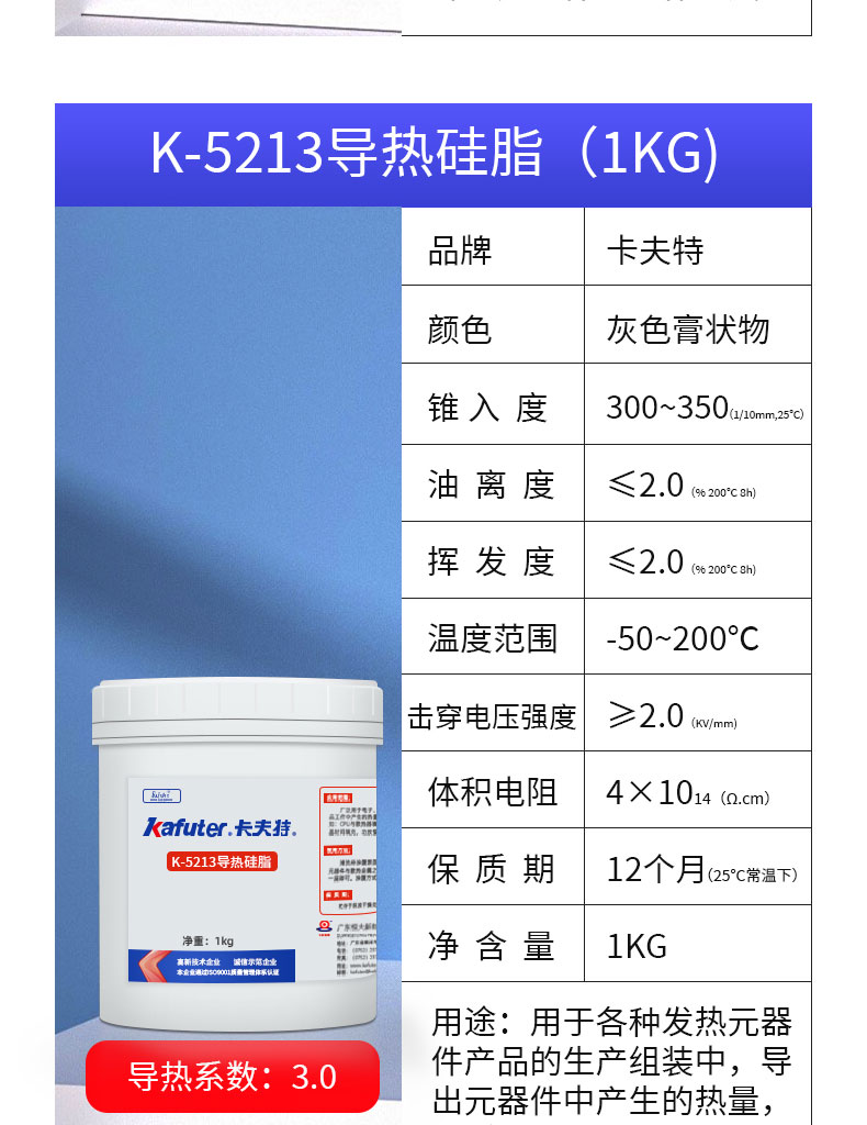 [下一个:卡夫特导热硅脂K-5212 2.0散热膏CPU 发热元件基材半导体导热1KG]