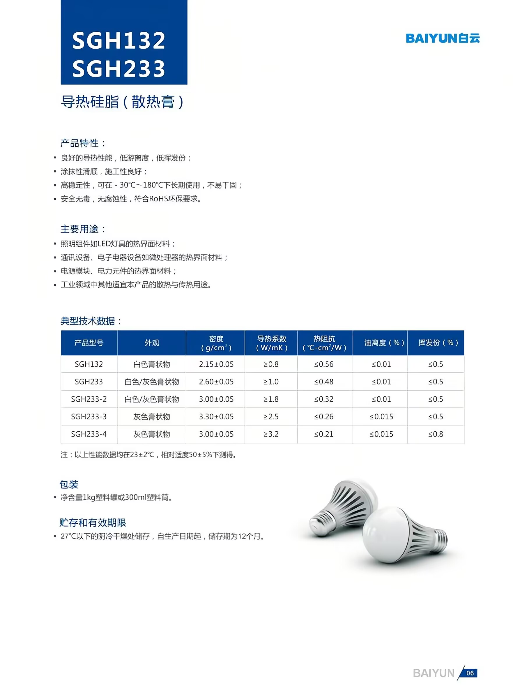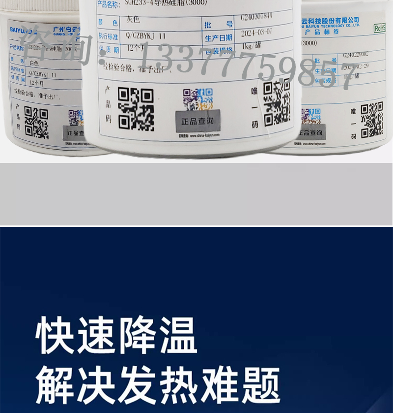白云233导热硅脂,SGH233-4灰色/≥3.2系数也被称为白云SGH233导热硅脂,是一种用于电子电器、CPU、主板、电机芯片等散热的产品,其导热系数为4.5(部分规格为1.5W/mK)广泛应用于各种电子电器设备中,如电脑的CPU、主板,电机的芯片LED灯具等照明设备的热界面材料,有效散发灯具产生的热量电源模块、电力元件的散热。 咨询热线:13377759857