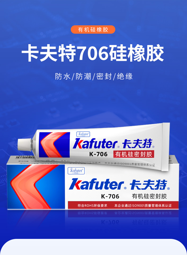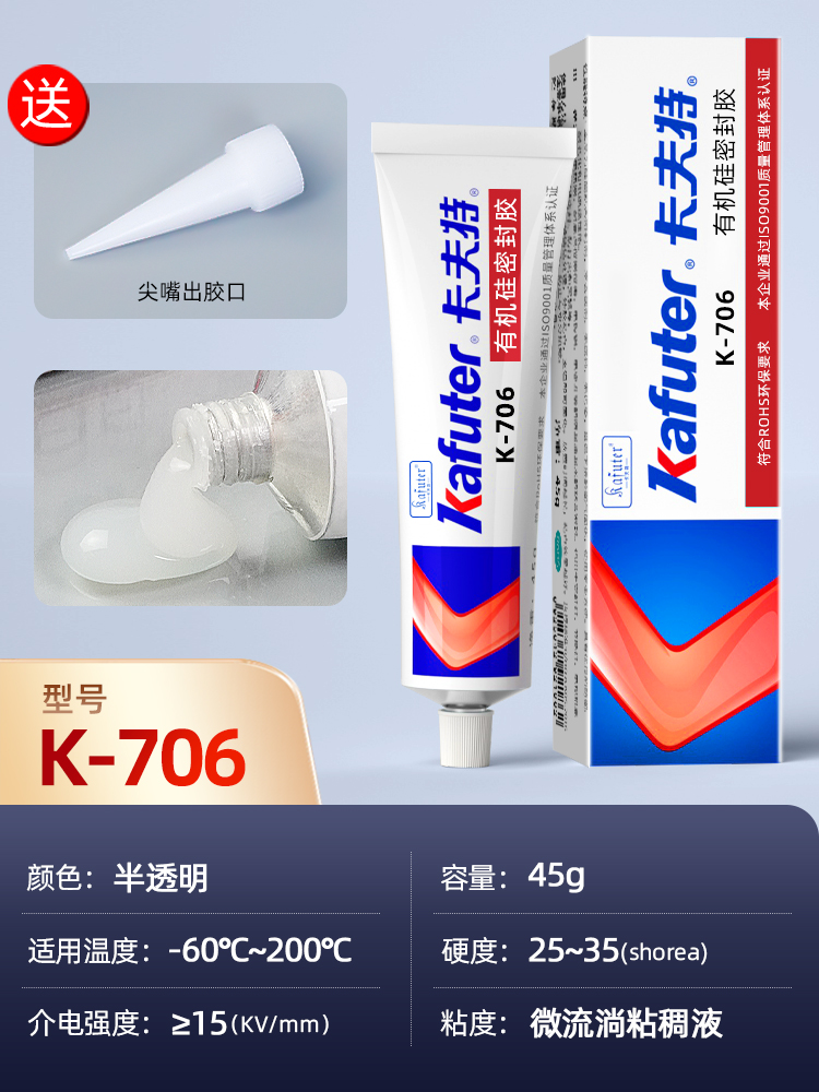 K-706(快干型有机硅密封胶)是一种可进行快速粘接的有机硅胶粘剂,绝缘性优、粘接性好,防、抗震、耐电晕、抗漏电。胶料对金属和大多数塑料的粘接性良好,固化后具有出色的抗冷热交变性能(-60 200℃)。卡夫特Kafuter官方授权经销商-东莞德润密封材料有限公司