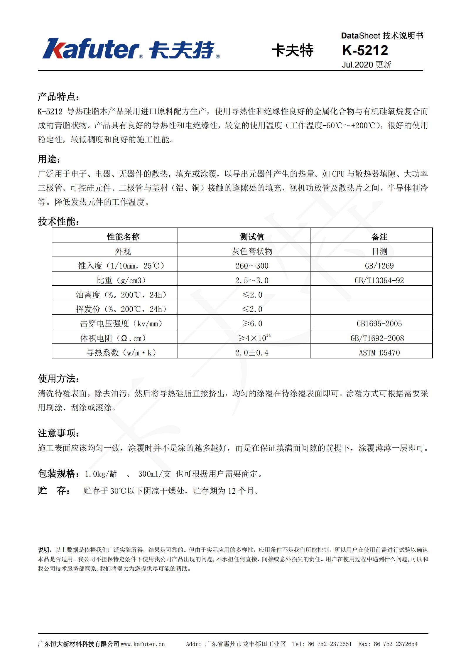 K-5211导热硅脂采用进口原料配方生产,使用导热性和绝缘性良好的金属氧化物与有机硅氧烷复合而成的膏脂状物。产品具有良好的导热性和电绝缘性,较宽的使用温度(工作温度-50C~+200C>很好的使用稳定性,较低的稠度和良好的施工性能。