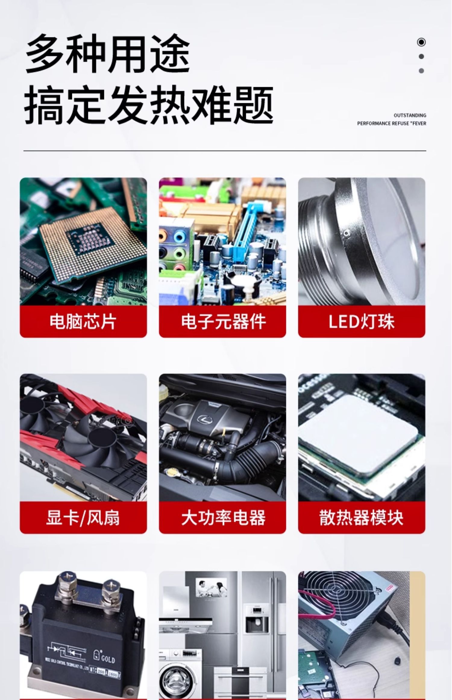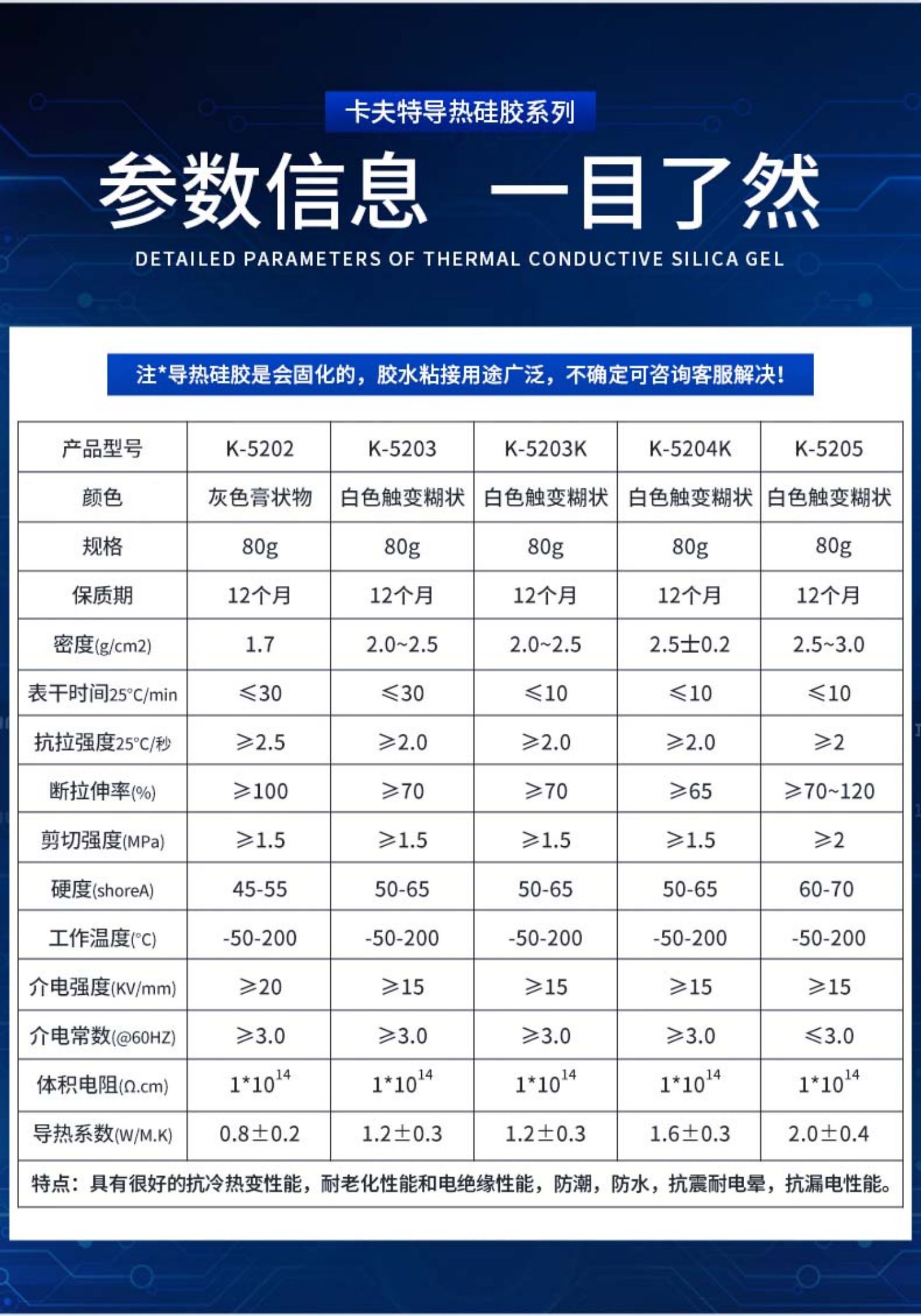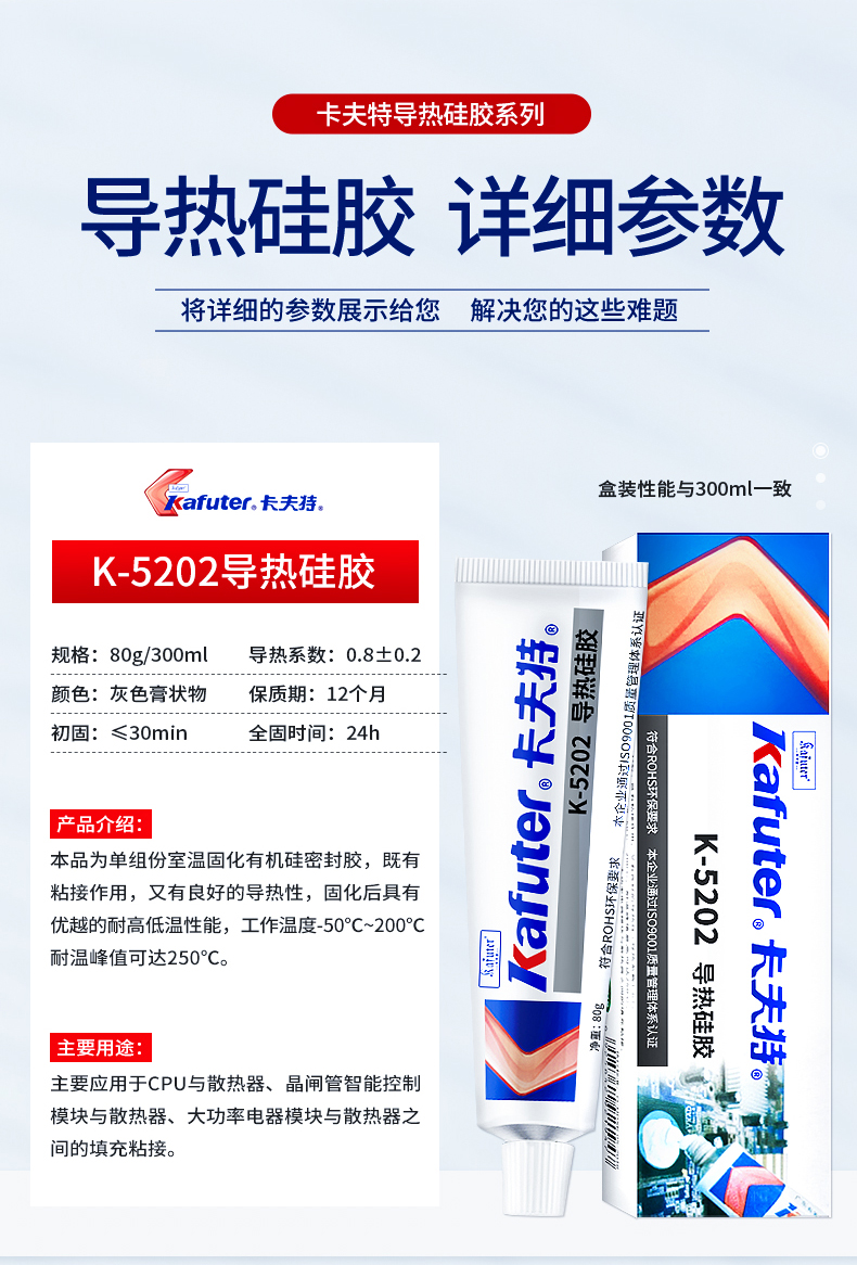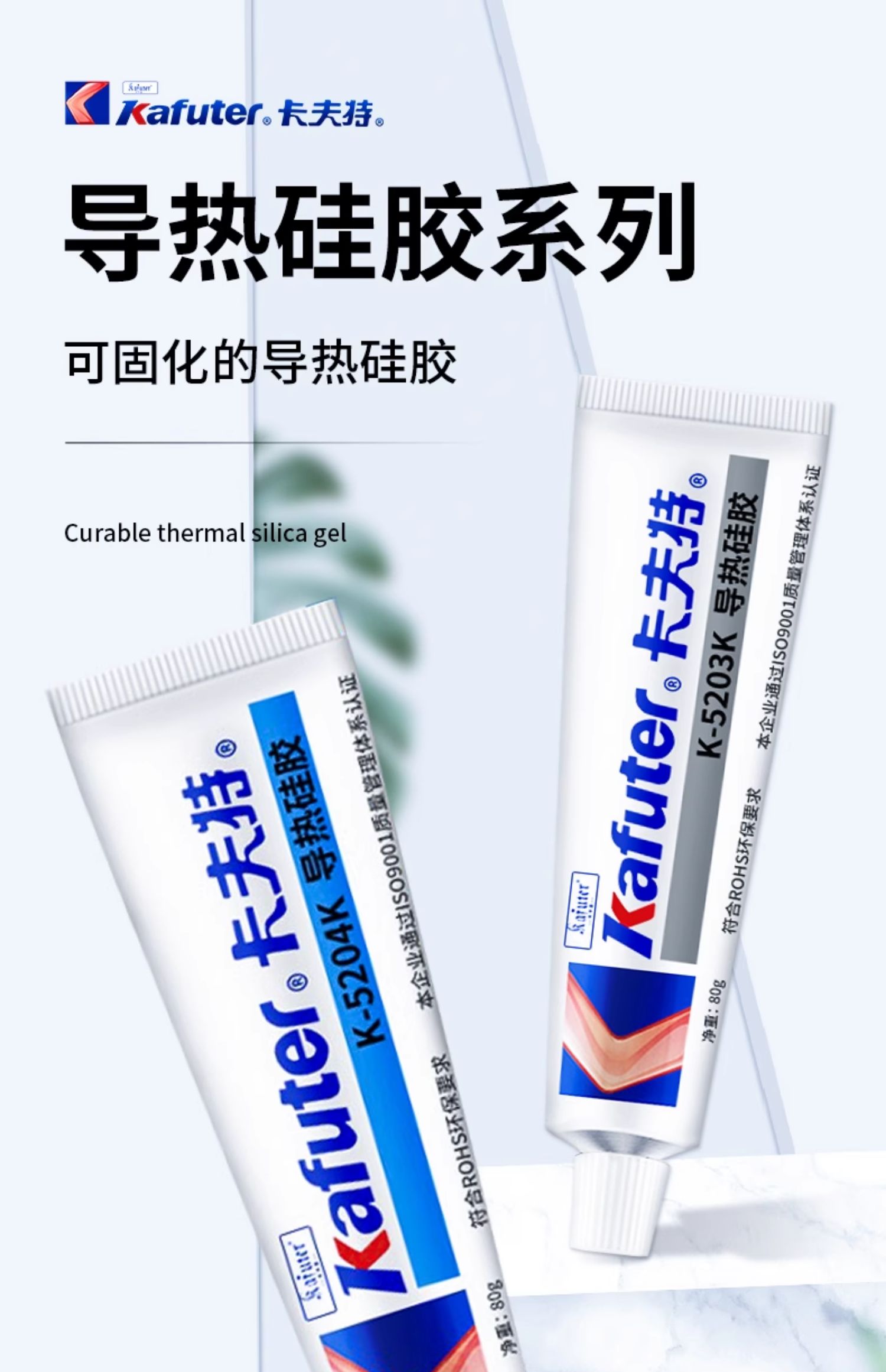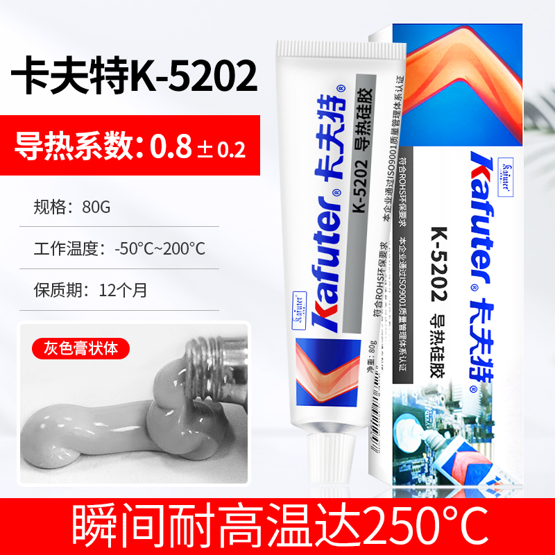 卡夫特K-5202导热硅胶导热胶CPU密封胶LED球灯固化散热胶灰色 80gK-5202导热硅胶(导热系数0.8)有机硅导热胶是一种单组分室温固化中性胶,既有粘接作用,又有良好的导热(散热)性。该胶经过补强,胶固化后长期使用不会脱落,有较高的粘接强度,不会产生接触缝隙降低散热效果;该胶具有良好的耐高低温性能,使用温度范围为-50℃~200℃;卡夫特Kafuter官方授权经销商-东莞德润密封材料有限公司www.gzderun.com,销售服务热线:15817734885,李经理