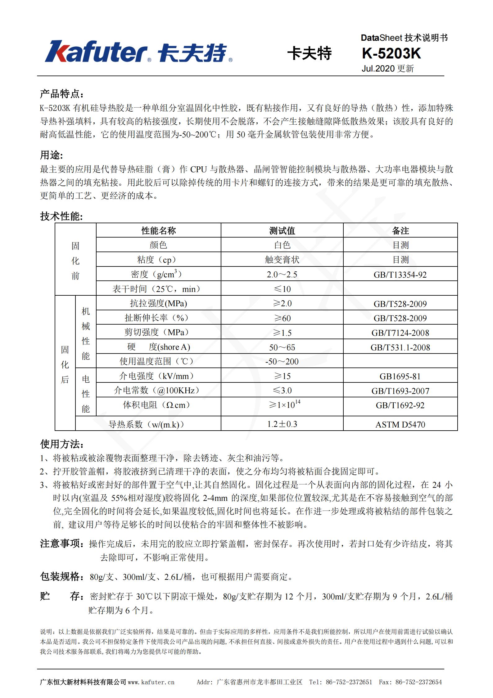 K-5203K导热硅胶(导热系数1.2)有机硅导热胶是一种单组分室温固化中性胶,既有粘接作用,又有良好的导热(散热)性,添加特殊导热补强填料,具有较高的粘接强度,长期使用不会脱落,不会产生接触缝隙降低散热效果;该胶具有良好的耐高低温性能,它的使用温度范围-50~200C;卡夫特Kafuter官方授权经销商-东莞德润密封材料有限公司