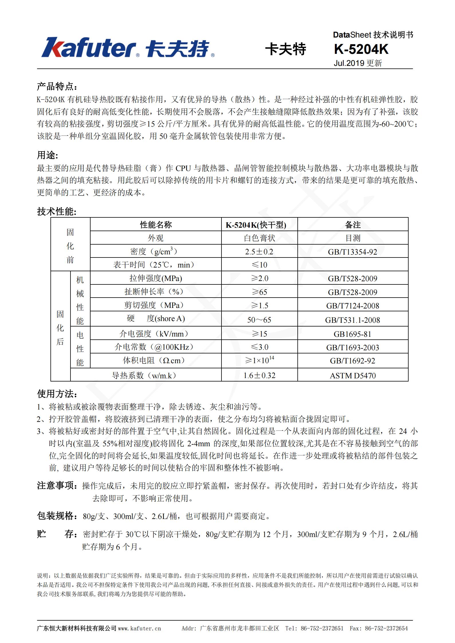 卡夫特K-5204K散热膏2.0高导热系数导热硅胶 快干绝缘耐高温芯片散热膏K-5204K导热硅胶(导热系数1.6)有机硅导热胶既有粘接作用,又有优异的导热(散热)性。是一种经过补强的中性有机硅弹性胶,胶固化后有良好的耐高低变化性能,长期使用不会脱落,不会产生接触缝隙降低散热效果;因为有了补强,该胶有较高的粘接强度,剪切强度z15公斤/平方厘米。具有优异的耐高低温性能。它的使用温度范围为-60℃~200℃;该胶是一种单组分室温固化胶。卡夫特Kafuter官方授权经销商-东莞德润密封材料有限公司www.gzderun.com,销售服务热线:15817734885,李经理