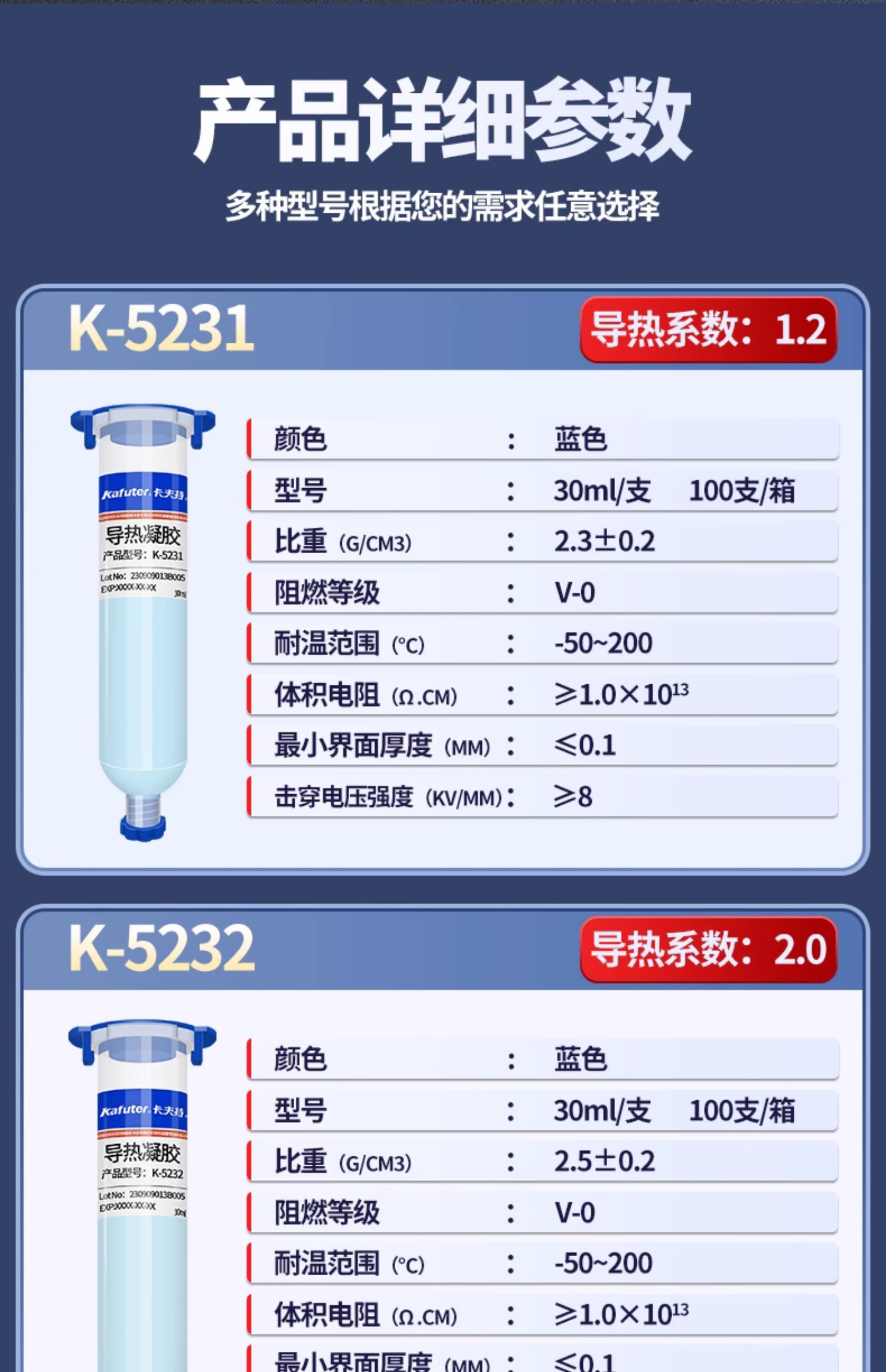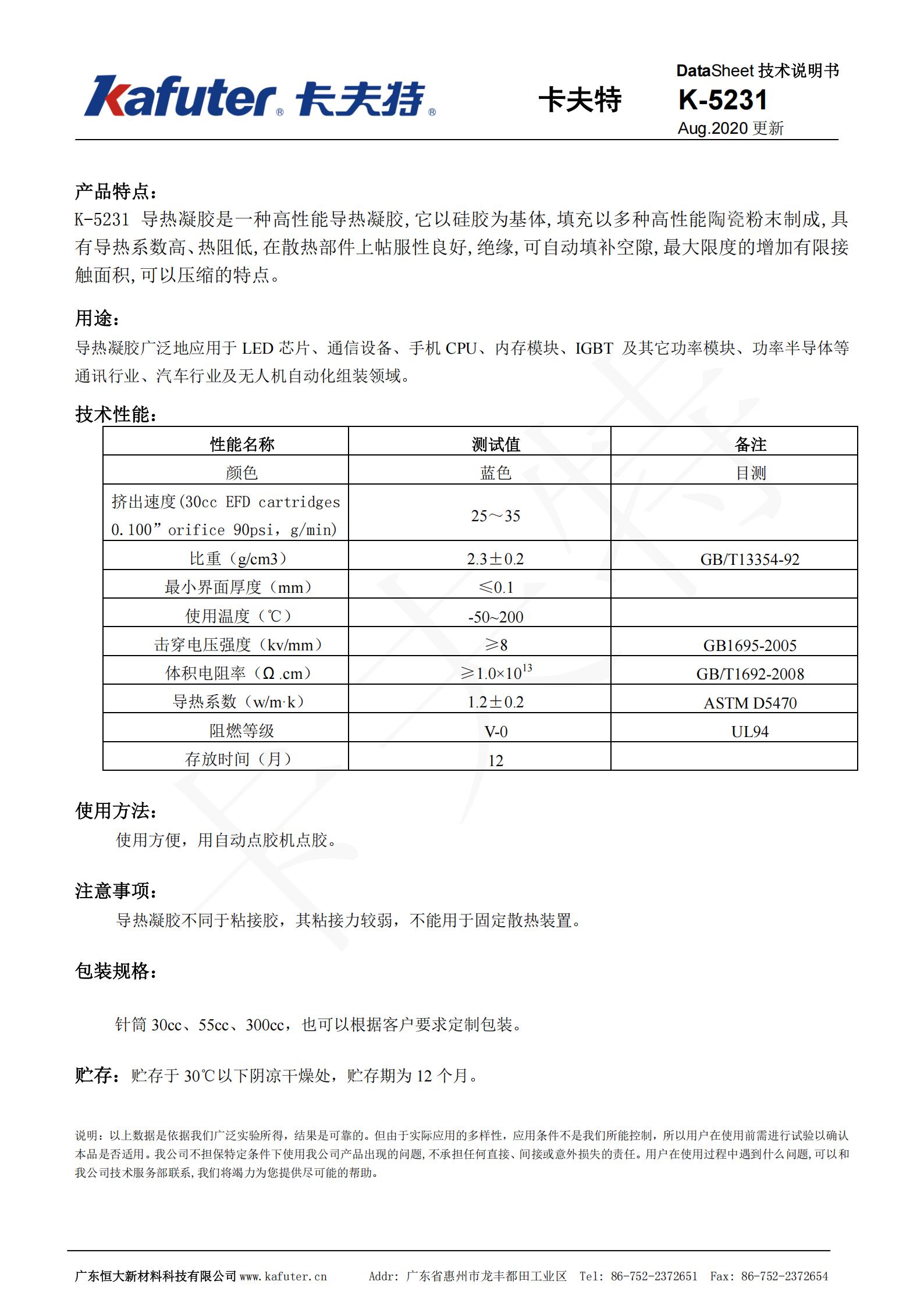 K-5231导热凝胶1.2w/(m.k)导热凝胶是一种高性能导热凝胶,它以硅胶为基体,填充以多种高性能陶瓷粉末制成,具有导热系数高、热阻低在散热部件上帖服性良好,绝缘,可自动填补空隙,最大限度的增加有限接触面积,可以压缩的特点。