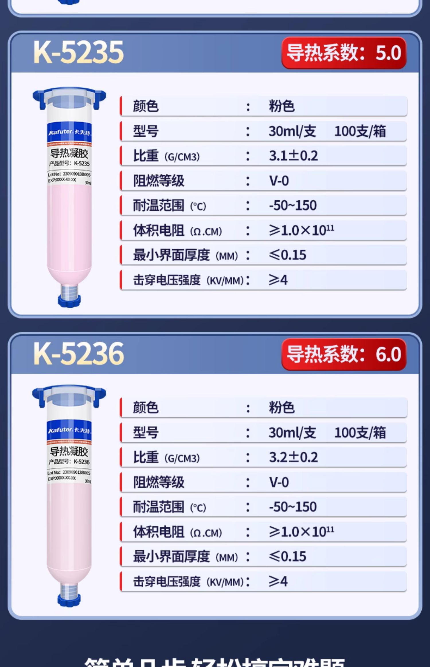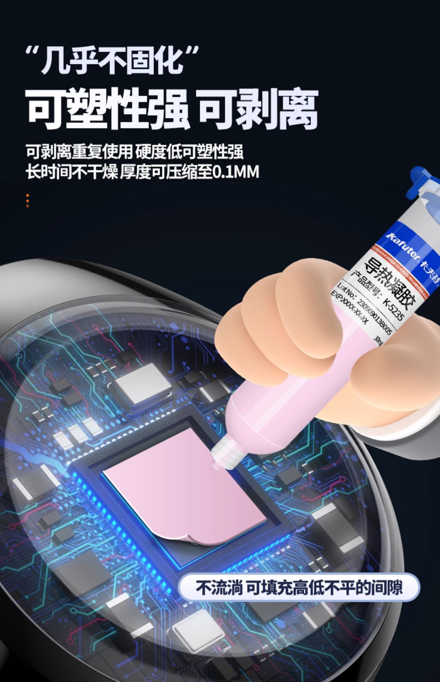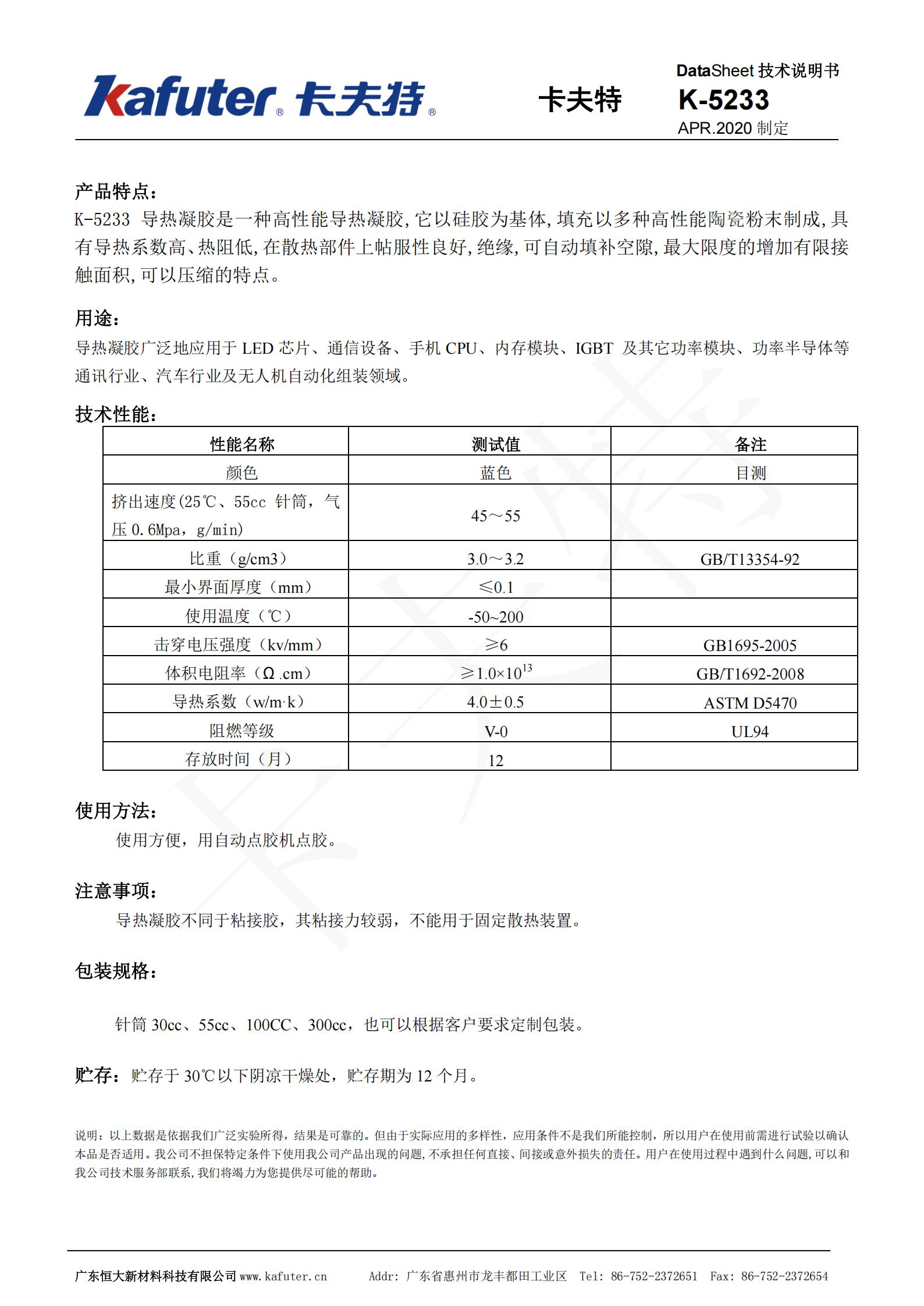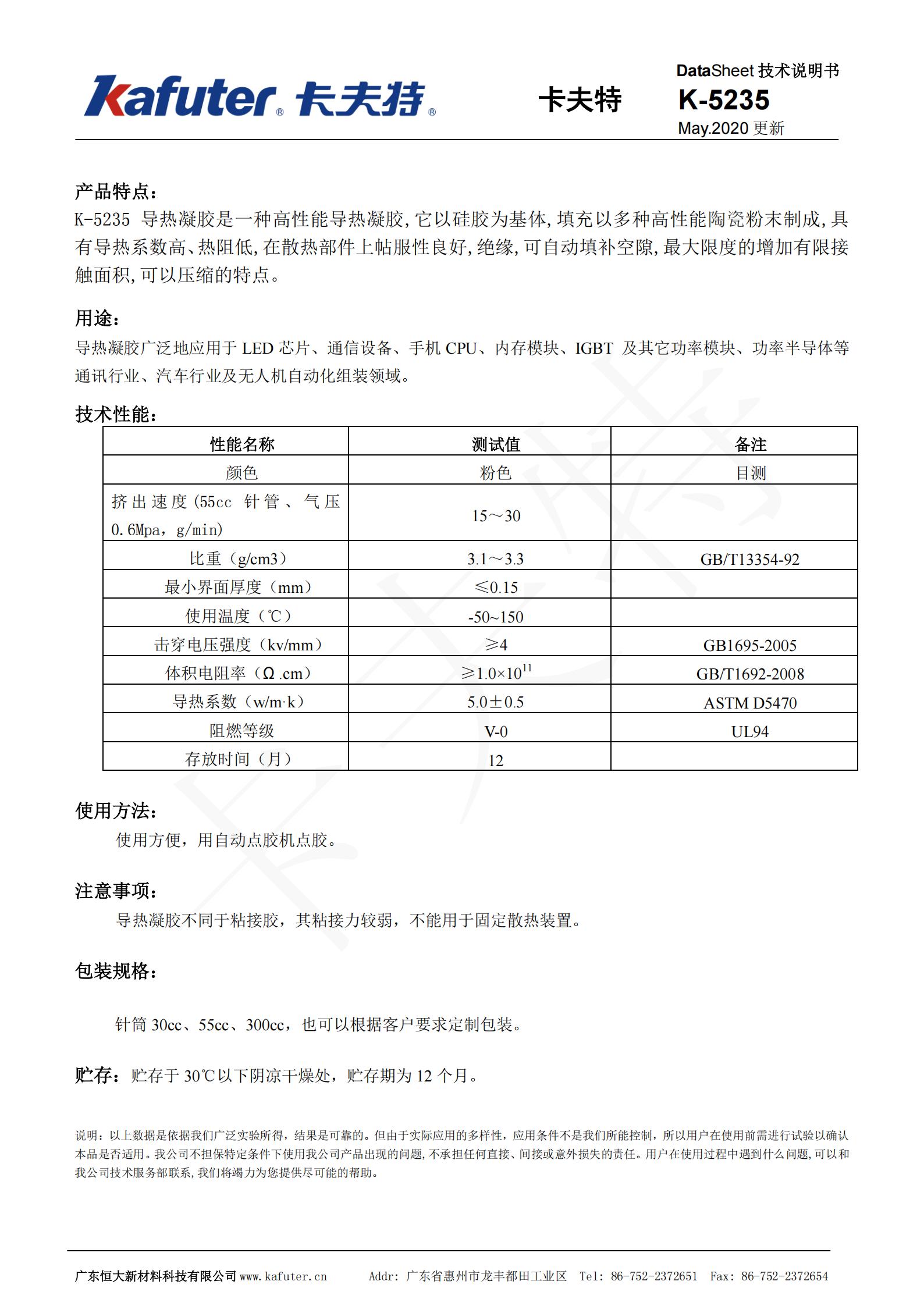 K-5235导热凝胶[5.0w/m.k]导热凝胶是一种高性能导热凝胶,它以硅胶为基体,填充以多种高性能陶瓷粉末制成,具有导热系数高、热阻低在散热部件上帖服性良好,绝缘,可自动填补空隙,最大限度的增加有限接触面积可以压缩的特点。卡夫特Kafuter官方授权经销商-东莞德润密封材料有限公司www.gzderun.com,销售服务热线:15817734885,李经理