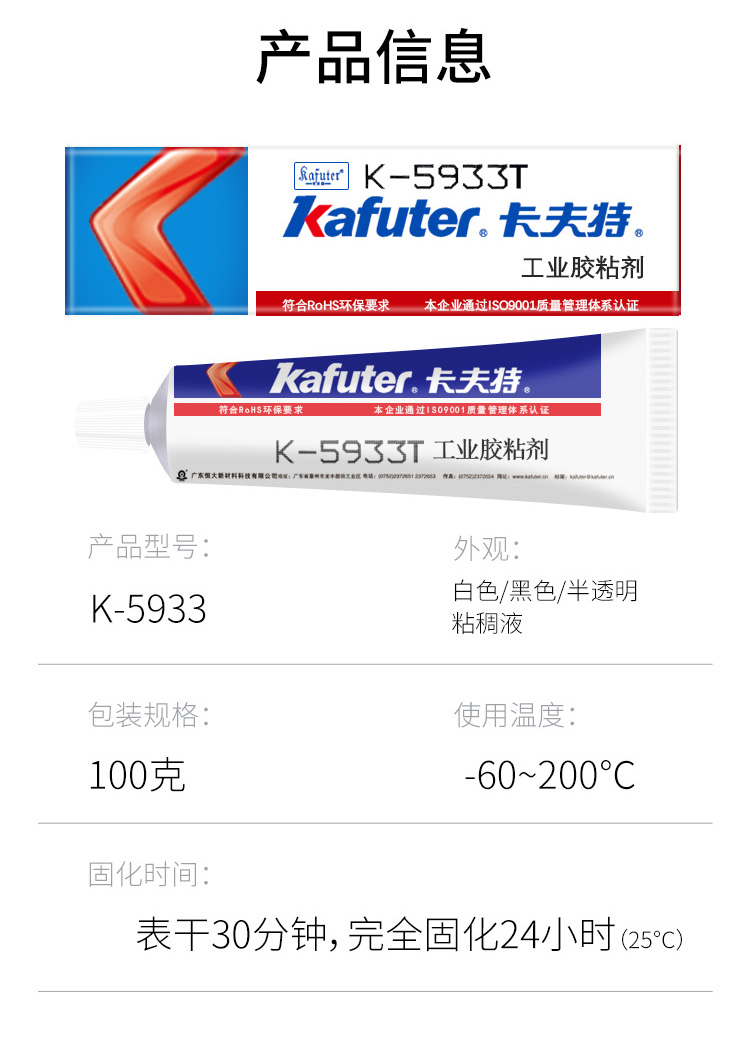 卡夫特工业胶粘剂K-5933B/W/T黑白电子电器元件粘接密封100克K-5933(单组分有机硅密封胶)系列为中等黏度室温固化单组份有机硅粘接密封胶,半流淌粘稠液体,本产品强度高,粘接性好,对铝、铜、不锈钢等多种金属有较好的粘接性;电性能优越,耐热性能好,一般使用温度范围-60℃~200℃。胶料对金属和大多数塑料的粘接性良好,固化后具有卓越的抗冷热交变性能。卡夫特Kafuter官方授权经销商-东莞德润密封材料有限公司www.gzderun.com,销售服务热线:15817734885,李经理