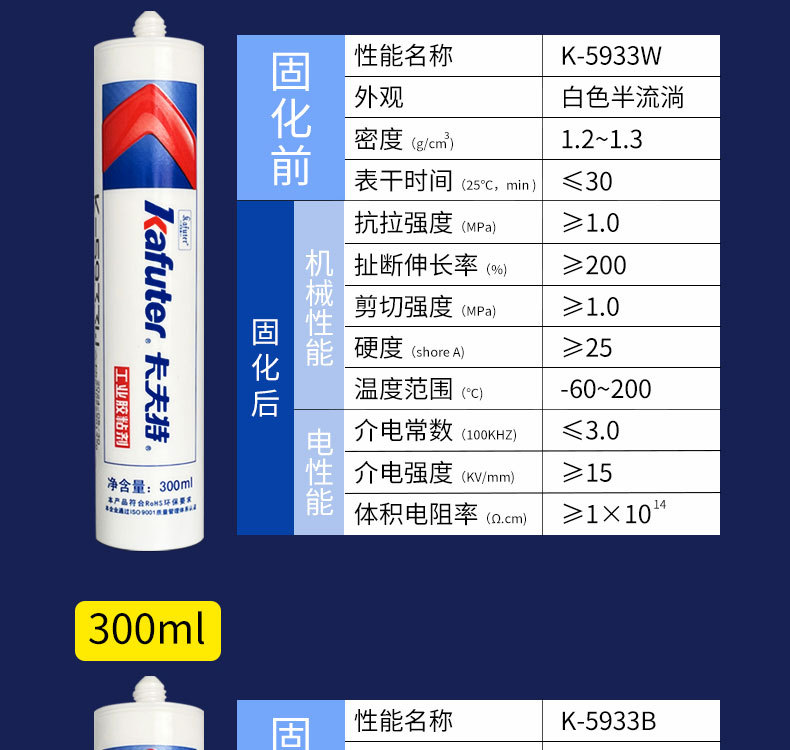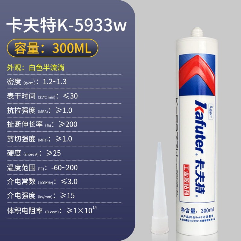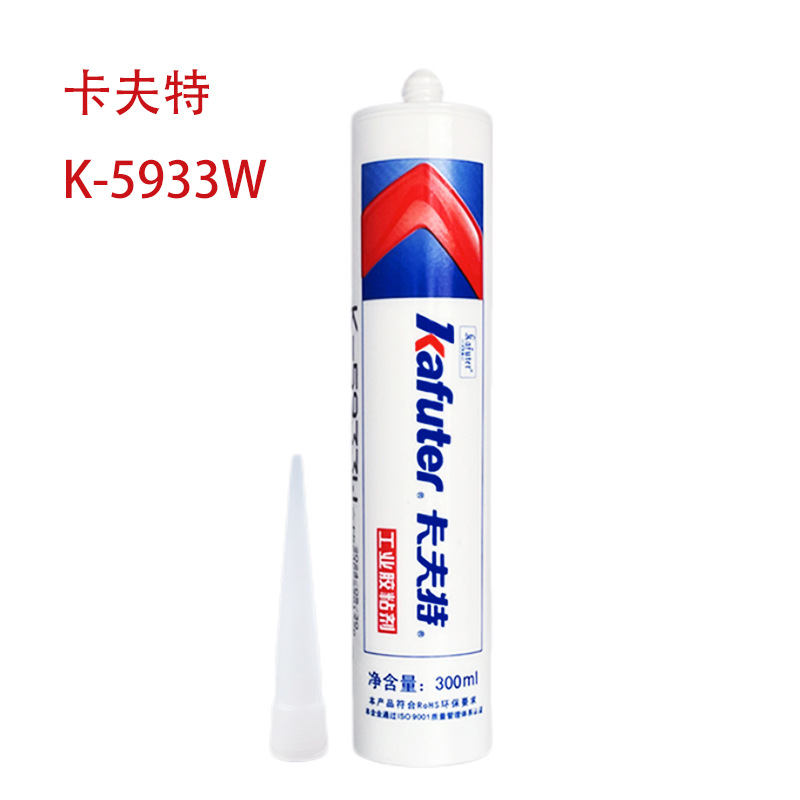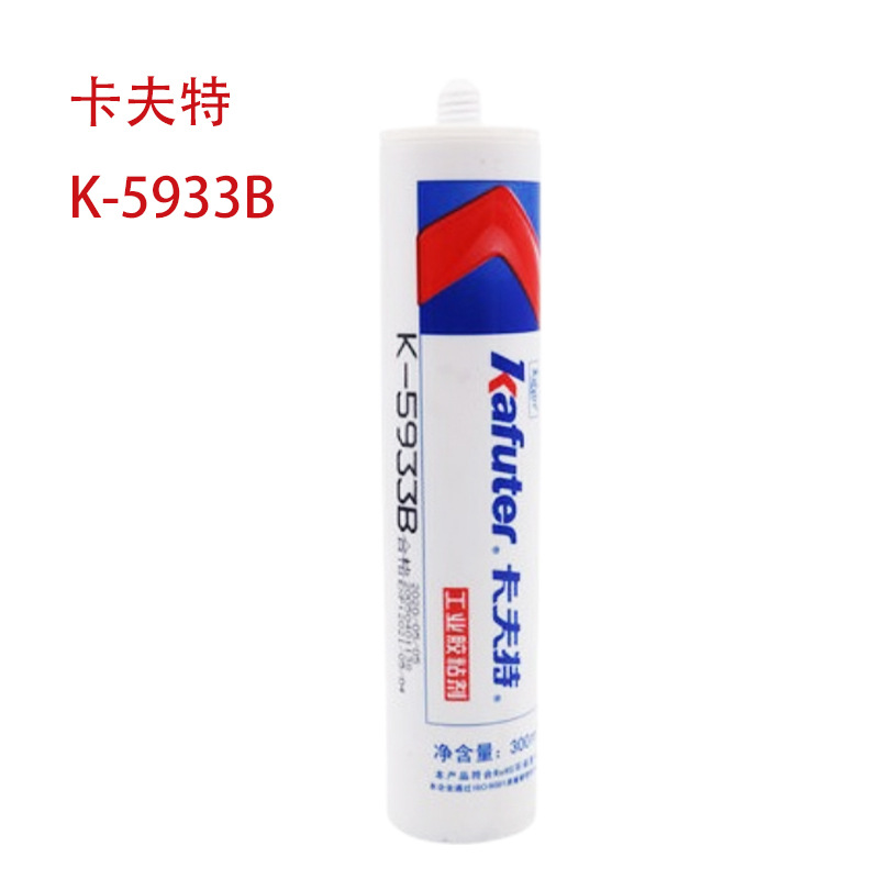 卡夫特K-5933W K-5933B K-5933T密封胶铝铜钢等金属粘接黑色透明K-5933(单组分有机硅密封胶)系列为中等黏度室温固化单组份有机硅粘接密封胶,半流淌粘稠液体,本产品强度高,粘接性好,对铝、铜、不锈钢等多种金属有较好的粘接性;电性能优越,耐热性能好,一般使用温度范围-60℃~200℃。胶料对金属和大多数塑料的粘接性良好,固化后具有卓越的抗冷热交变性能。卡夫特Kafuter官方授权经销商-东莞德润密封材料有限公司www.gzderun.com,销售服务热线:15817734885,李经理